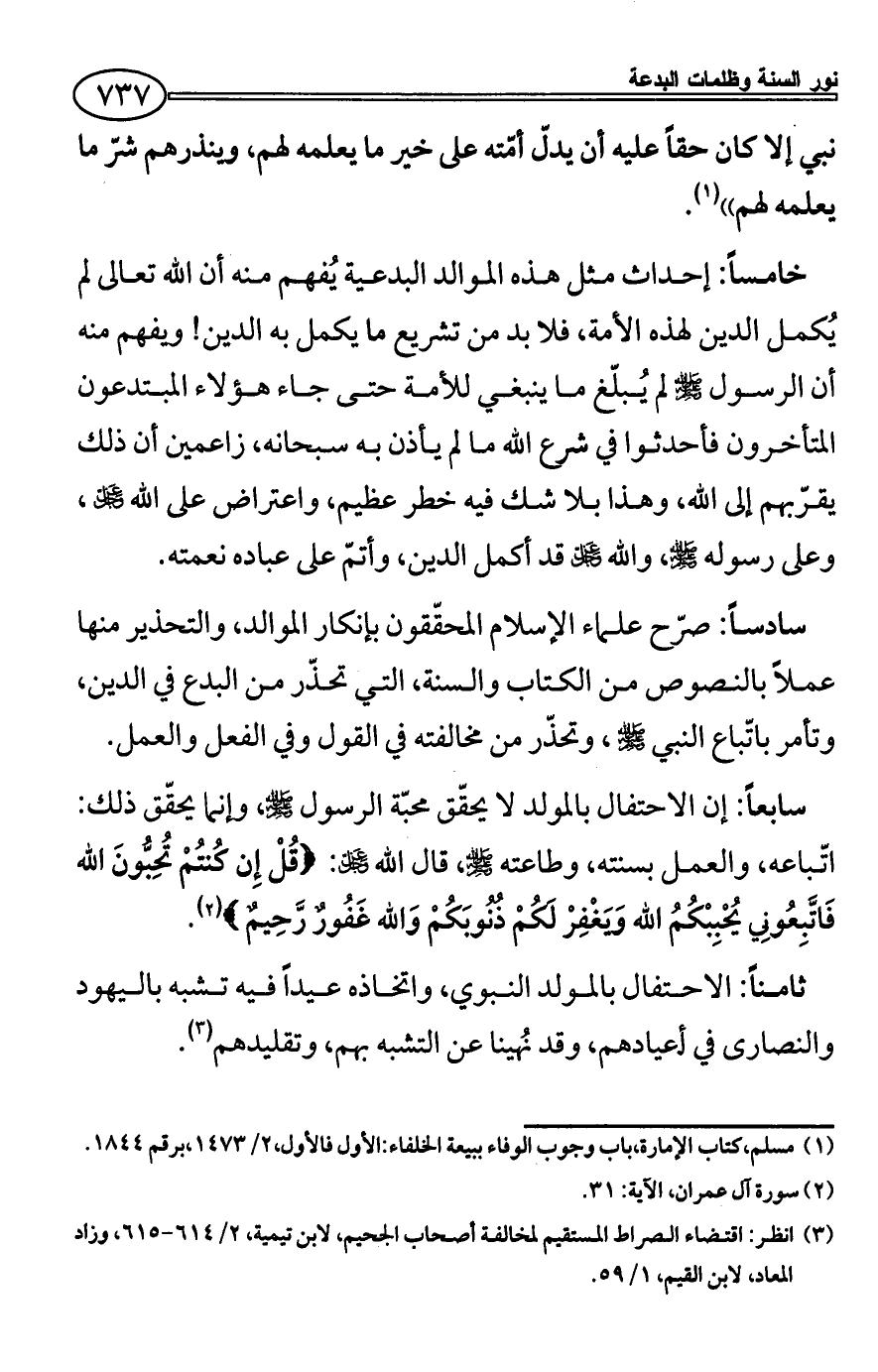 سادساً: صرّح علماء الإسلام المحقّقون بإنكار الموالد، والتحذير منها عملاً بالنصوص من الكتاب والسنة، التي تحذّر من البدع في الدين، وتأمر باتّباع النبي - صلى الله عليه وسلم -، وتحذّر من مخالفته في القول وفي الفعل والعمل.