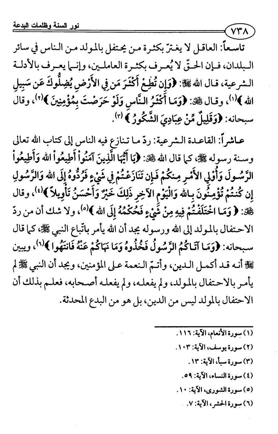عاشراً: القاعدة الشرعية: ردّ ما تنازع فيه الناس إلى كتاب الله تعالى وسنة رسوله - صلى الله عليه وسلم -، كما قال الله - عز وجل -: {يَا أَيُّهَا الَّذِينَ آمَنُواْ أَطِيعُواْ الله وَأَطِيعُواْ الرَّسُولَ وَأُوْلِي الأَمْرِ مِنكُمْ فَإِن تَنَازَعْتُمْ فِي شَيْءٍ فَرُدُّوهُ إِلَى الله وَالرَّسُولِ إِن كُنتُمْ تُؤْمِنُونَ بِالله وَالْيَوْمِ الآخِرِ ذَلِكَ خَيْرٌ وَأَحْسَنُ تَأْوِيلا} (¬4)، وقال - عز وجل -: {وَمَا اخْتَلَفْتُمْ فِيهِ مِنْ شَيْءٍ فَحُكْمُهُ إِلَى الله} (¬5)، ولا شك أن من ردّ الاحتفال بالمولد إلى الله ورسوله يجد أن الله يأمر باتّباع النبي - صلى الله عليه وسلم -، كما قال سبحانه: {وَمَا آتَاكُمُ الرَّسُولُ فَخُذُوهُ وَمَا نَهَاكُمْ عَنْهُ فَانتَهُوا} (¬6)، ويبين - سبحانه وتعالى - أنه قد أكمل الدين، وأتمّ النعمة على المؤمنين، ويجد أن النبي - صلى الله عليه وسلم - لم يأمر بالاحتفال بالمولد، ولم يفعله، ولم يفعله أصحابه، فعلم بذلك أن الاحتفال بالمولد ليس من الدين، بل هو من البدع المحدثة.