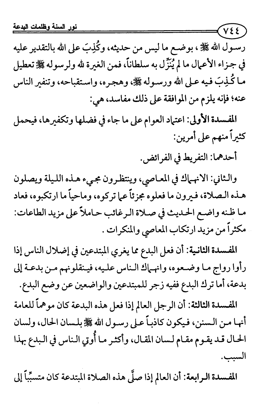 المفسدة الرابعة: أن العالم إذا صلَّى هذه الصلاة المبتدعة كان متسبِّباً إلى أن تكذب العامة على رسول الله - صلى الله عليه وسلم -، فيقولون هذه سنة من السنن.
