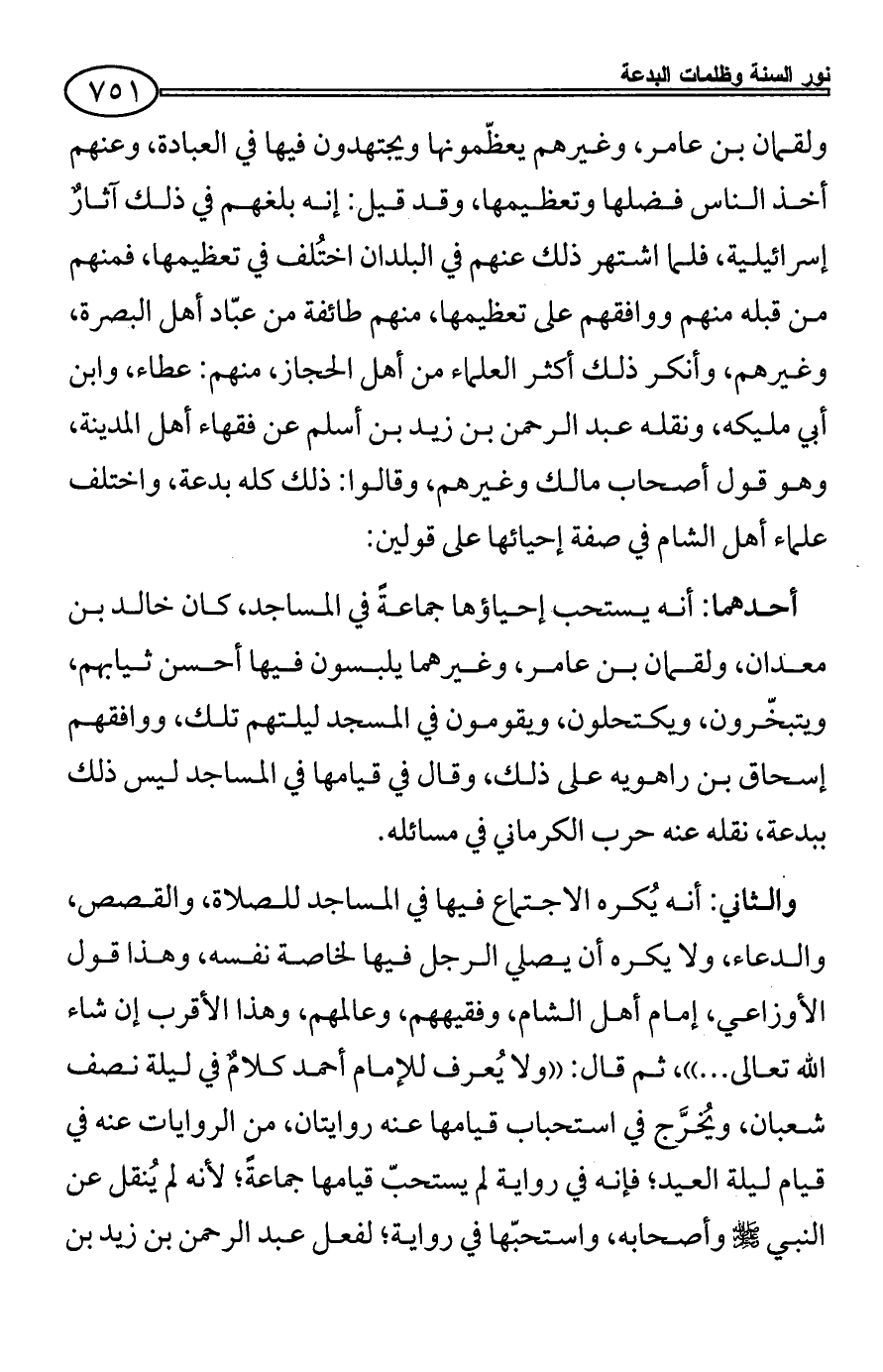 ولقمان بن عامر, وغيرهم يعظّمونها ويجتهدون فيها في العبادة, وعنهم أخذ الناس فضلها وتعظيمها, وقد قيل: إنه بلغهم في ذلك آثارٌ إسرائيلية, فلما اشتهر ذلك عنهم في البلدان اختُلف في تعظيمها، فمنهم من قبله منهم ووافقهم على تعظيمها، منهم طائفة من عبّاد أهل البصرة، وغيرهم، وأنكر ذلك أكثر العلماء من أهل الحجاز، منهم: عطاء، وابن أبي مليكه، ونقله عبد الرحمن بن زيد بن أسلم عن فقهاء أهل المدينة، وهو قول أصحاب مالك وغيرهم، وقالوا: ذلك كله بدعة، واختلف علماء أهل الشام في صفة إحيائها على قولين: