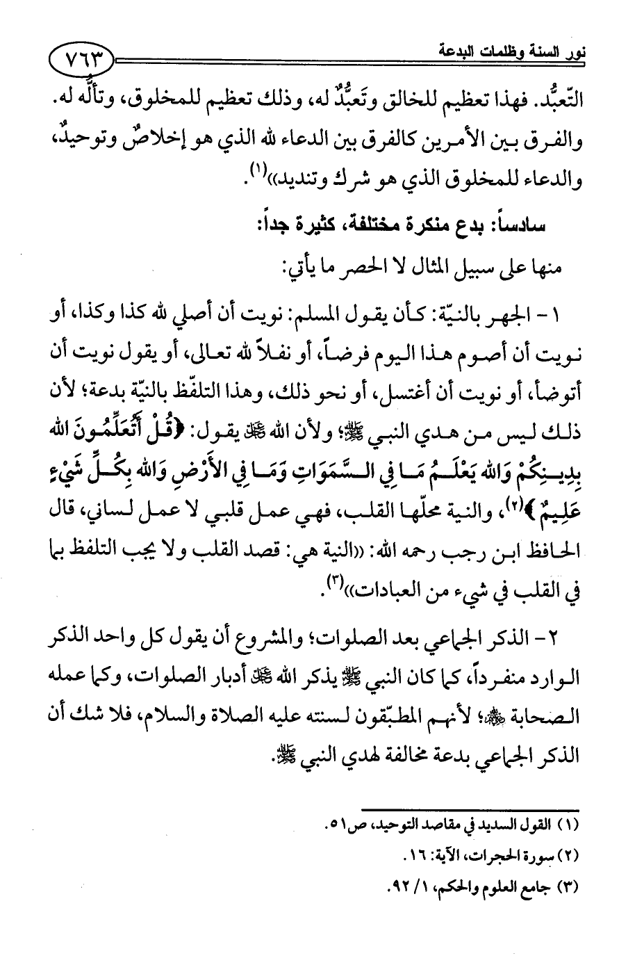 1 - الجهر بالنيّة: كأن يقول المسلم: نويت أن أصلي لله كذا وكذا، أو نويت أن أصوم هذا اليوم فرضاً، أو نفلاً لله تعالى، أو يقول نويت أن أتوضأ، أو نويت أن أغتسل، أو نحو ذلك، وهذا التلفّظ بالنيّة بدعة؛ لأن ذلك ليس من هدي النبي - صلى الله عليه وسلم -؛ ولأن الله - عز وجل - يقول: {قُلْ أَتُعَلِّمُونَ الله بِدِينِكُمْ وَالله يَعْلَمُ مَا فِي السَّمَوَاتِ وَمَا فِي الأَرْضِ وَالله بِكُلِّ شَيْءٍ
