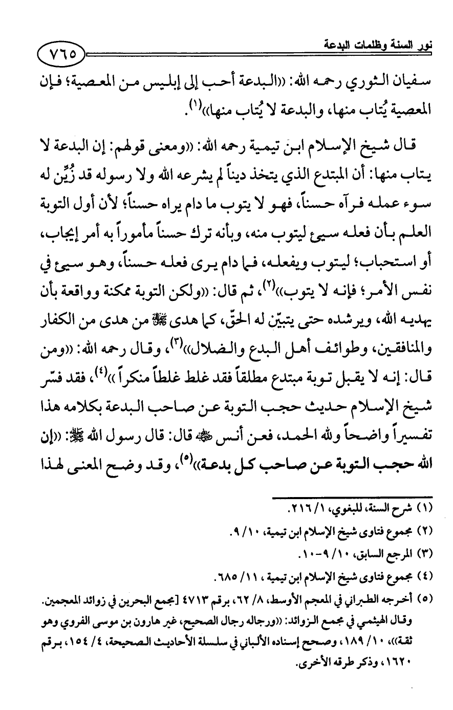 سفيان الثوري رحمه الله: ((البدعة أحب إلى إبليس من المعصية؛ فإن المعصية يُتاب منها، والبدعة لا يُتاب منها)) (¬1).