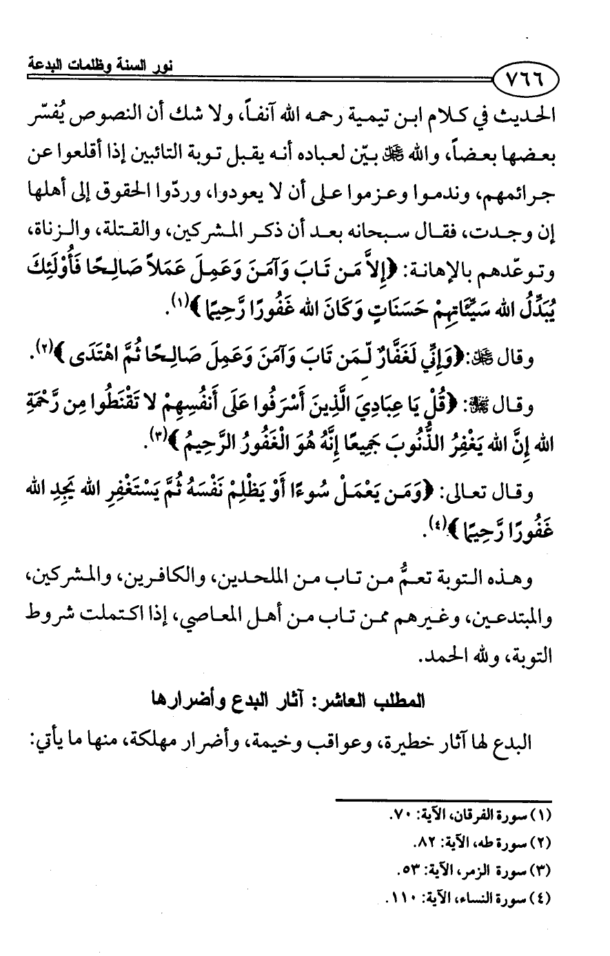 الحديث في كلام ابن تيمية رحمه الله آنفاً، ولا شك أن النصوص يُفسّر بعضها بعضاً، والله - عز وجل - بيّن لعباده أنه يقبل توبة التائبين إذا أقلعوا عن جرائمهم، وندموا وعزموا على أن لا يعودوا، وردّوا الحقوق إلى أهلها إن وجدت، فقال سبحانه بعد أن ذكر المشركين، والقتلة، والزناة، وتوعّدهم بالإهانة: {إِلاَّ مَن تَابَ وَآمَنَ وَعَمِلَ عَمَلاً صَالِحًا فَأُوْلَئِكَ يُبَدِّلُ الله سَيِّئَاتِهِمْ حَسَنَاتٍ وَكَانَ الله غَفُورًا رَّحِيمًا} (¬1).