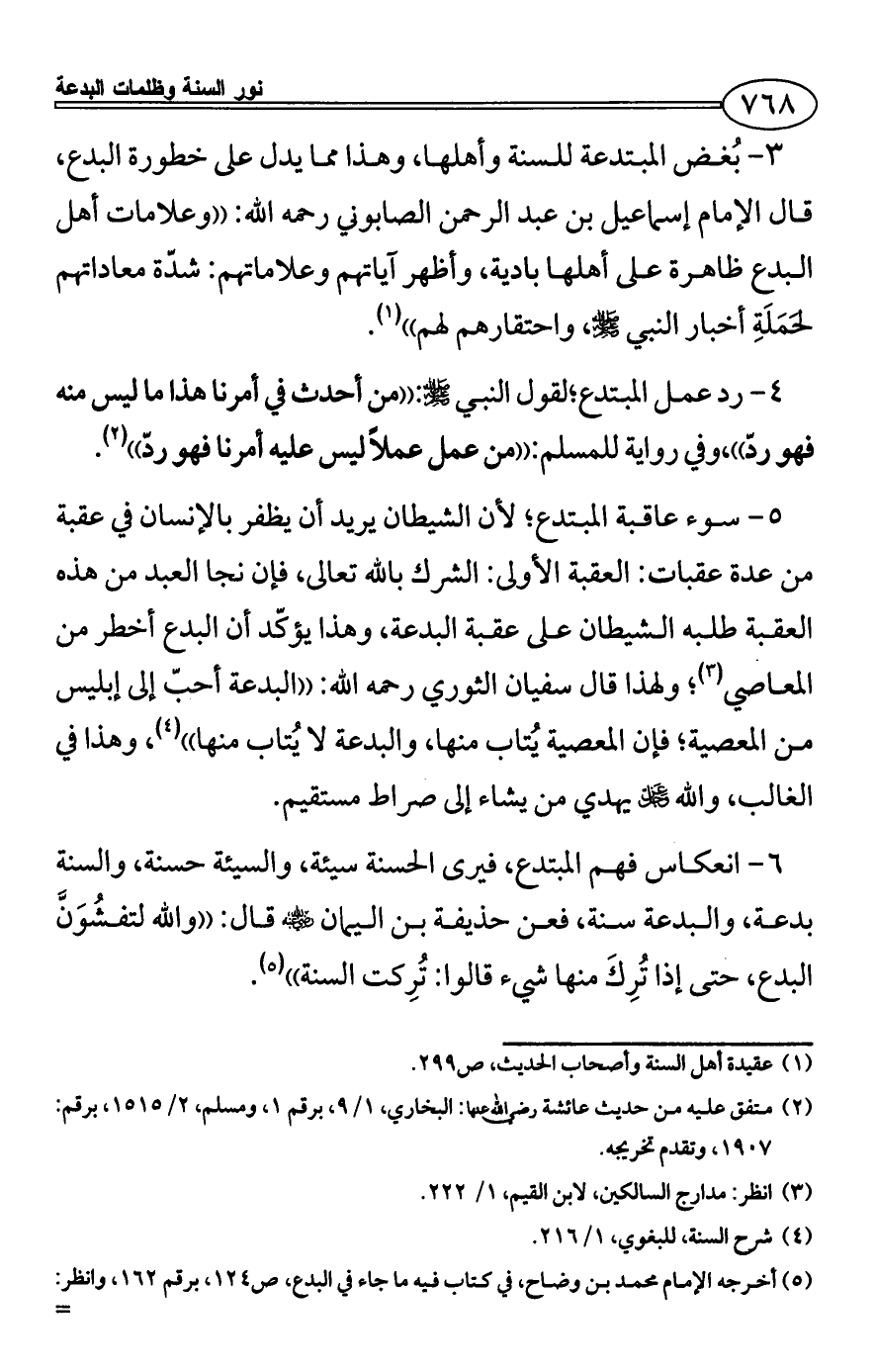 5 - سوء عاقبة المبتدع؛ لأن الشيطان يريد أن يظفر بالإنسان في عقبة من عدة عقبات: العقبة الأولى: الشرك بالله تعالى، فإن نجا العبد من هذه العقبة طلبه الشيطان على عقبة البدعة، وهذا يؤكّد أن البدع أخطر من المعاصي (¬3)؛ ولهذا قال سفيان الثوري رحمه الله: ((البدعة أحبّ إلى إبليس من المعصية؛ فإن المعصية يُتاب منها، والبدعة لا يُتاب منها)) (¬4)، وهذا في الغالب، والله - عز وجل - يهدي من يشاء إلى صراط مستقيم.