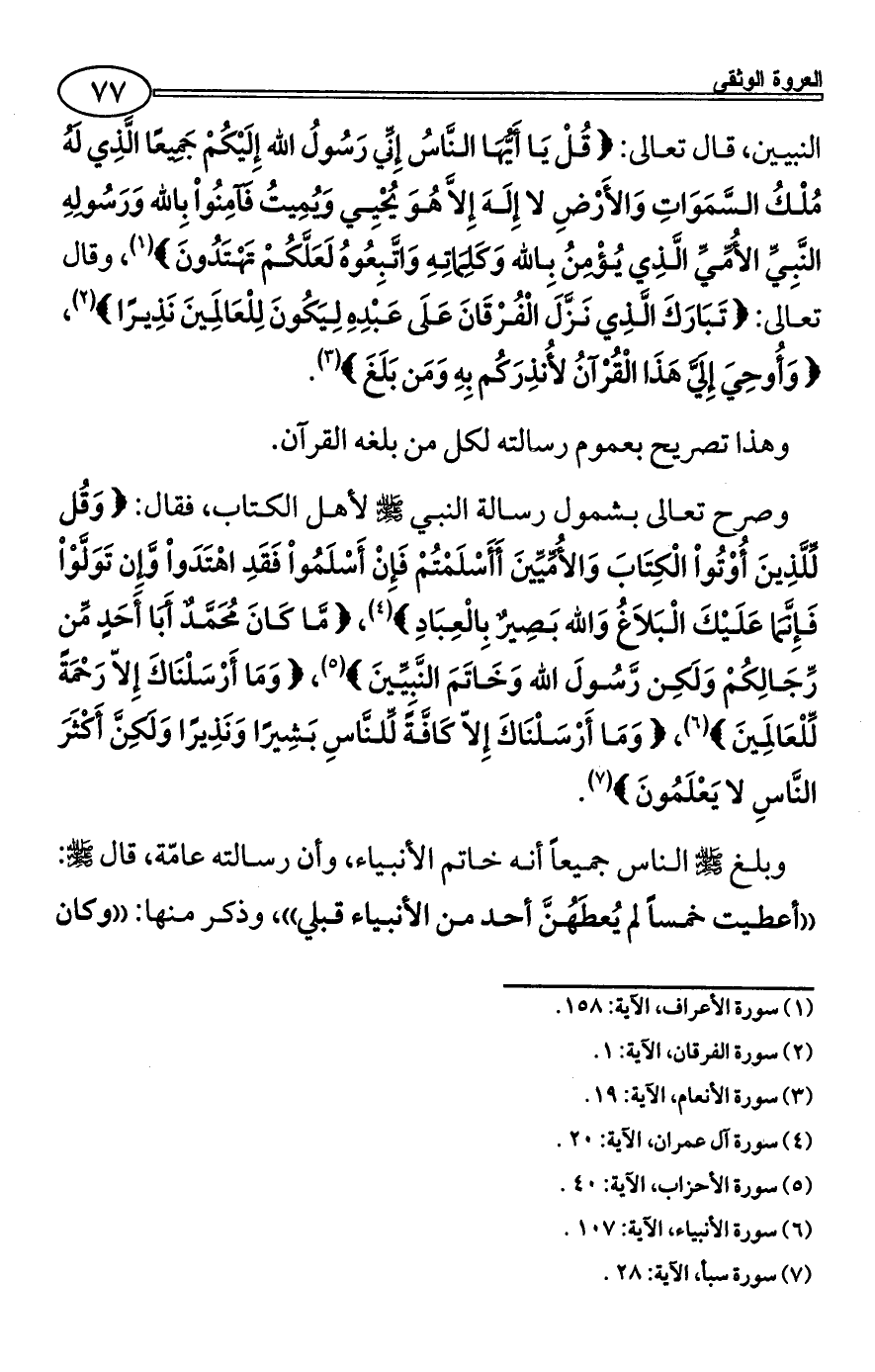 وصرح تعالى بشمول رسالة النبي - صلى الله عليه وسلم - لأهل الكتاب، فقال: {وَقُل لِّلَّذِينَ أُوْتُواْ الْكِتَابَ وَالأُمِّيِّينَ أَأَسْلَمْتُمْ فَإِنْ أَسْلَمُواْ فَقَدِ اهْتَدَواْ وَّإِن تَوَلَّوْاْ فَإِنَّمَا عَلَيْكَ الْبَلاَغُ وَالله بَصِيرٌ بِالْعِبَادِ} (¬3)، {مَّا كَانَ مُحَمَّدٌ أَبَا أَحَدٍ مِّن رِّجَالِكُمْ وَلَكِن رَّسُولَ الله وَخَاتَمَ النَّبِيِّينَ} (¬4)، {وَمَا أَرْسَلْنَاكَ إِلاّ رَحْمَةً لِّلْعَالَمِينَ} (¬5)، {وَمَا أَرْسَلْنَاكَ إِلاّ كَافَّةً لِّلنَّاسِ بَشِيرًا وَنَذِيرًا وَلَكِنَّ أَكْثَرَ النَّاسِ لا يَعْلَمُونَ} (¬6).