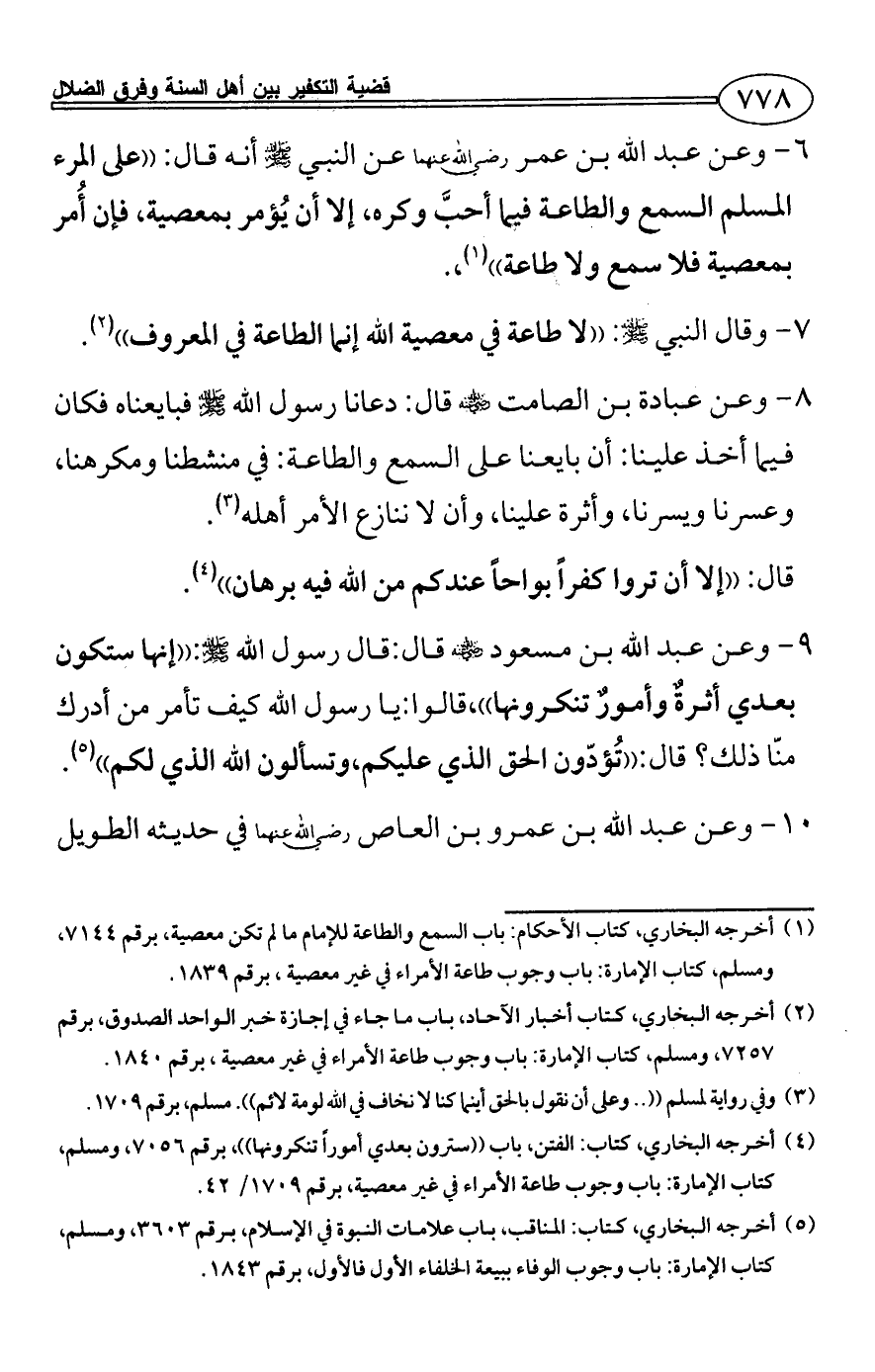 (¬1) أخرجه البخاري، كتاب الأحكام: باب السمع والطاعة للإمام ما لم تكن معصية، برقم 7144، ومسلم، كتاب الإمارة: باب وجوب طاعة الأمراء في غير معصية، برقم 1839.