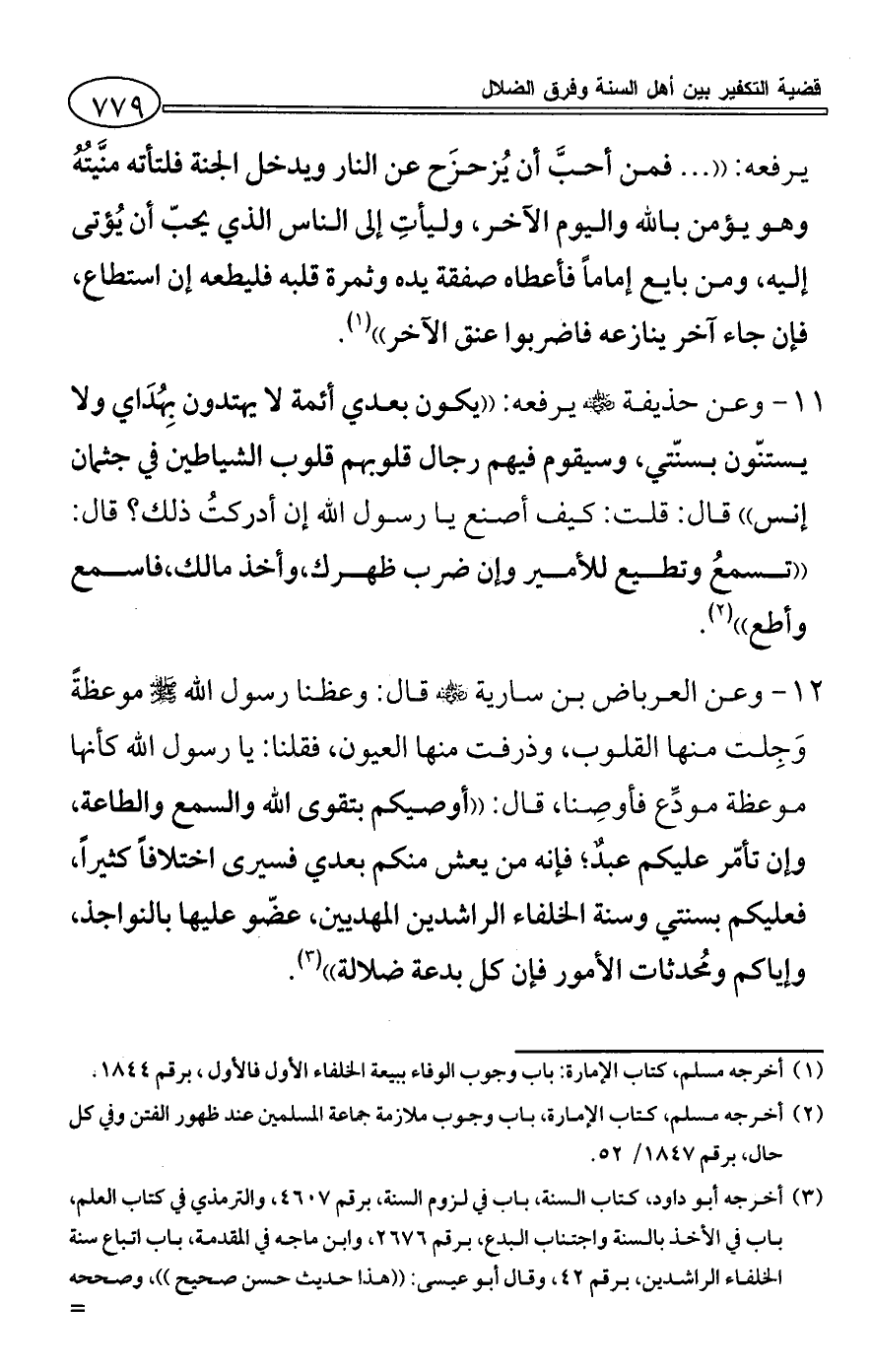 (¬3) أخرجه أبو داود، كتاب السنة، باب في لزوم السنة، برقم 4607، والترمذي في كتاب العلم، باب في الأخذ بالسنة واجتناب البدع، برقم 2676، وابن ماجه في المقدمة، باب اتباع سنة الخلفاء الراشدين، برقم 42، وقال أبو عيسى: ((هذا حديث حسن صحيح))، وصححه الألباني في صحيح الجامع، برقم 2549.