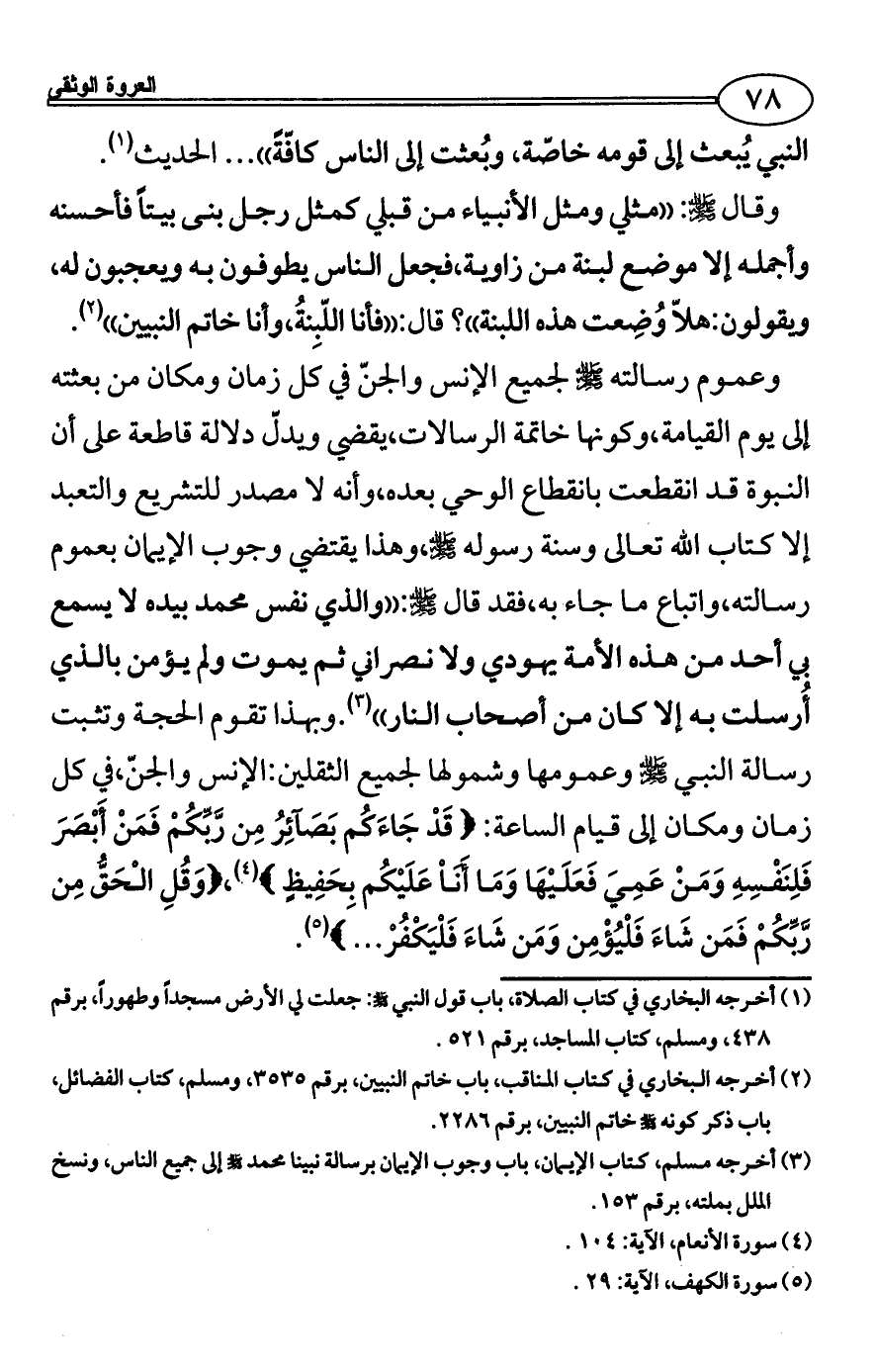 وعموم رسالته - صلى الله عليه وسلم - لجميع الإنس والجنّ في كل زمان ومكان من بعثته إلى يوم القيامة، وكونها خاتمة الرسالات، يقضي ويدلّ دلالة قاطعة على أن النبوة قد انقطعت بانقطاع الوحي بعده، وأنه لا مصدر للتشريع والتعبد إلا كتاب الله تعالى وسنة رسوله - صلى الله عليه وسلم -،وهذا يقتضي وجوب الإيمان بعموم رسالته، واتباع ما جاء به، فقد قال - صلى الله عليه وسلم -: ((والذي نفس محمد بيده لا يسمع بي أحد من هذه الأمة يهودي ولا نصراني ثم يموت ولم يؤمن بالذي أُرسلت به إلا كان من أصحاب النار)) (¬2).وبهذا تقوم الحجة وتثبت رسالة النبي - صلى الله عليه وسلم - وعمومها وشمولها لجميع الثقلين: الإنس والجنّ، في كل زمان ومكان إلى قيام الساعة: {قَدْ جَاءَكُم بَصَآئِرُ مِن رَّبِّكُمْ فَمَنْ أَبْصَرَ فَلِنَفْسِهِ وَمَنْ عَمِيَ فَعَلَيْهَا وَمَا أَنَاْ عَلَيْكُم بِحَفِيظٍ} (¬3)، {وَقُلِ الْحَقُّ مِن رَّبِّكُمْ فَمَن شَاءَ فَلْيُؤْمِن وَمَن شَاءَ فَلْيَكْفُرْ ... } (¬4).