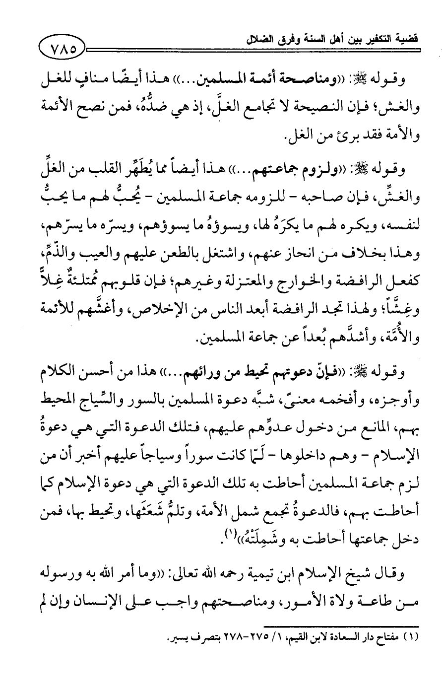 وقوله - صلى الله عليه وسلم -: ((فإنّ دعوتهم تحيط من ورائهم ... )) هذا من أحسن الكلام وأوجزه، وأفخمه معنىً، شبَّه دعوة المسلمين بالسور والسِّياج المحيط بهم، المانع من دخول عدوِّهم عليهم، فتلك الدعوة التي هي دعوةُ الإسلام - وهم داخلوها - لَمّا كانت سوراً وسياجاً عليهم أخبر أن من لزم جماعة المسلمين أحاطت به تلك الدعوة التي هي دعوة الإسلام كما أحاطت بهم، فالدعوةُ تجمع شمل الأمة، وتلمُّ شَعَثَها، وتحيط بها، فمن دخل جماعتها أحاطت به وشَمِلَتْهُ)) (¬1).