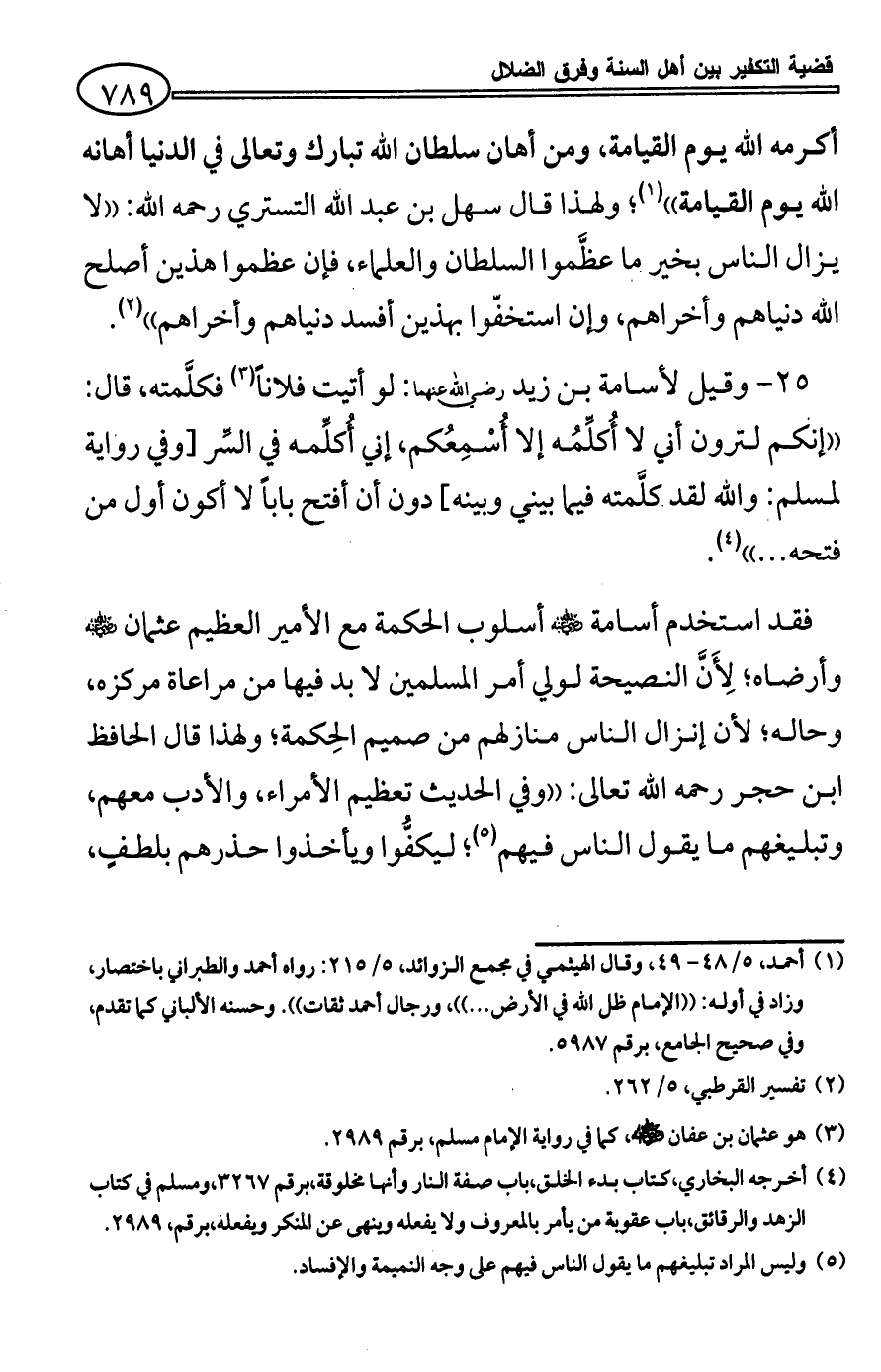 25 - وقيل لأسامة بن زيد رضي الله عنهما: لو أتيت فلاناً (¬3) فكلَّمته، قال: ((إنكم لترون أني لا أُكلِّمُه إلا أُسْمِعُكم، إني أُكلِّمه في السِّر [وفي رواية لمسلم: والله لقد كلَّمته فيما بيني وبينه] دون أن أفتح باباً لا أكون أول من فتحه ... )) (¬4).