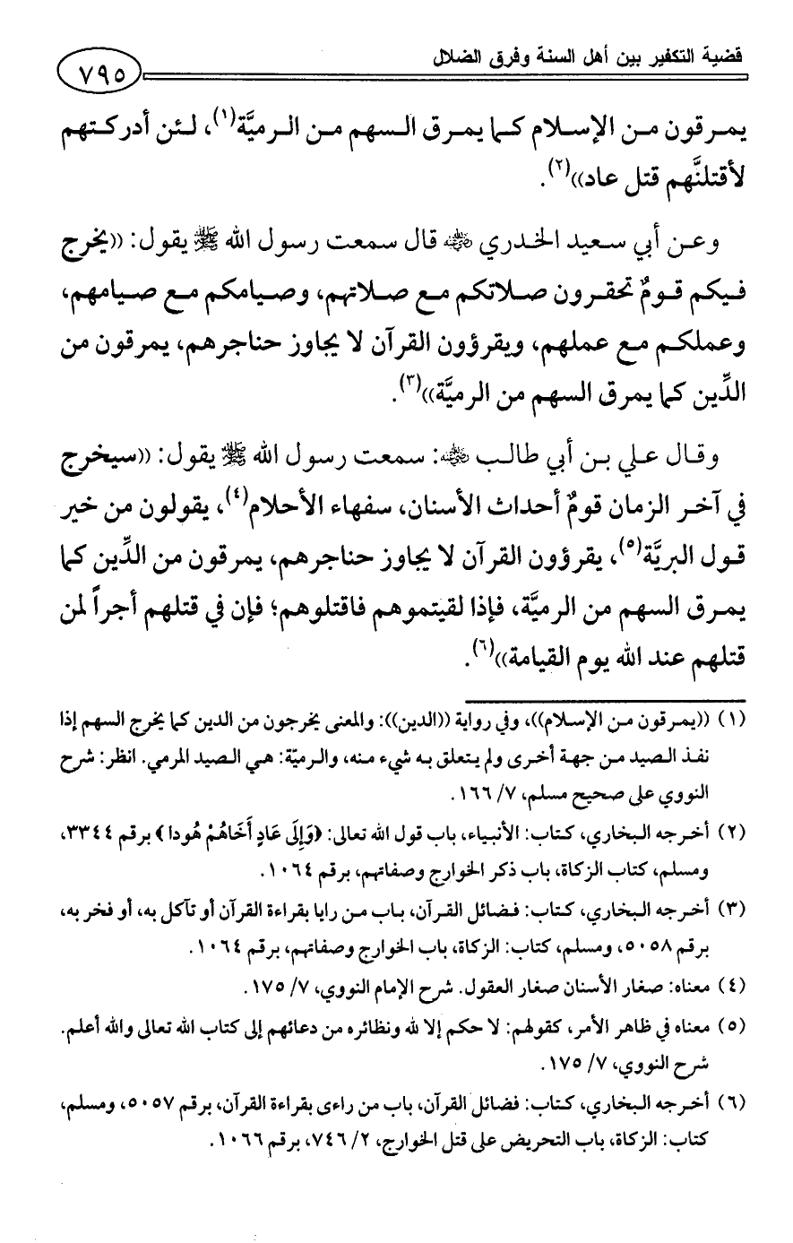 (¬6) أخرجه البخاري، كتاب: فضائل القرآن، باب من راءى بقراءة القرآن، برقم 5057، ومسلم، كتاب: الزكاة، باب التحريض على قتل الخوارج، 2/ 746، برقم 1066.