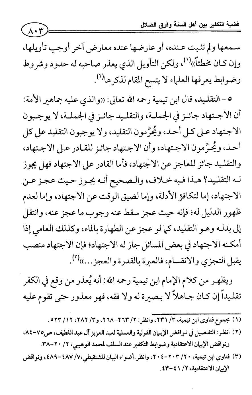 (¬3) فتاوى ابن تيمية، 20/ 203 - 204، وانظر: أضواء البيان للشنقيطي،7/ 487 - 489، ونواقض الإيمان الاعتقادية، 2/ 41 - 43.