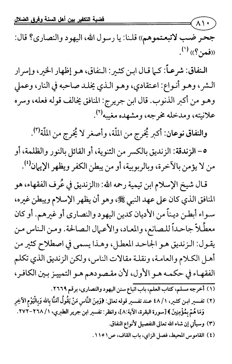 (¬2) تفسير ابن كثير، 1/ 48 عند تفسير قوله تعالى: {وَمِنَ النَّاسِ مَنْ يَقُولُ آمَنَّا بِالله وَبِالْيَوْمِ الآخِرِ وَمَا هُمْ بِمُؤْمِنِينَ} [سورة البقرة، الآية:8]، وانظر: تفسير ابن جرير الطبري، 1/ 268 - 272.