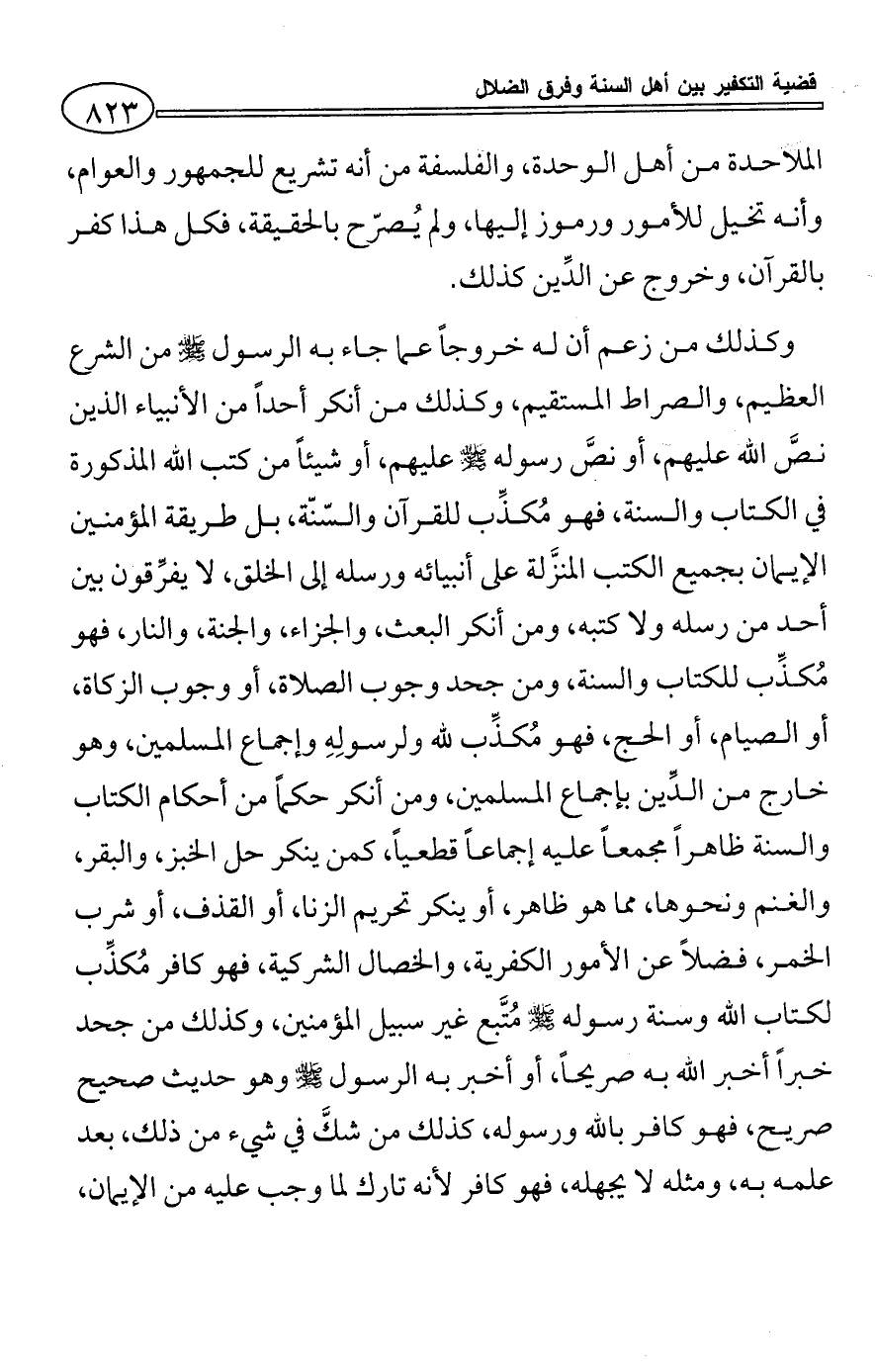 وكذلك من زعم أن له خروجاً عما جاء به الرسول - صلى الله عليه وسلم - من الشرع العظيم، والصراط المستقيم، وكذلك من أنكر أحداً من الأنبياء الذين نصَّ الله عليهم، أو نصَّ رسوله - صلى الله عليه وسلم - عليهم، أو شيئاً من كتب الله المذكورة في الكتاب والسنة، فهو مُكذِّب للقرآن والسّنّة، بل طريقة المؤمنين الإيمان بجميع الكتب المنزَّلة على أنبيائه ورسله إلى الخلق، لا يفرِّقون بين أحد من رسله ولا كتبه، ومن أنكر البعث، والجزاء، والجنة، والنار، فهو مُكذِّب للكتاب والسنة، ومن جحد وجوب الصلاة، أو وجوب الزكاة، أو الصيام، أو الحج، فهو مُكذِّب لله ولرسولِهِ وإجماع المسلمين، وهو خارج من الدِّين بإجماع المسلمين، ومن أنكر حكماً من أحكام الكتاب والسنة ظاهراً مجمعاً عليه إجماعاً قطعياً، كمن ينكر حل الخبز، والبقر، والغنم ونحوها، مما هو ظاهر، أو ينكر تحريم الزنا، أو القذف، أو شرب الخمر، فضلاً عن الأمور الكفرية، والخصال الشركية، فهو كافر مُكذِّب لكتاب الله وسنة رسوله - صلى الله عليه وسلم - مُتَّبع غير سبيل المؤمنين، وكذلك من جحد خبراً أخبر الله به صريحاً، أو أخبر به الرسول - صلى الله عليه وسلم - وهو حديث صحيح صريح، فهو كافر بالله ورسوله، كذلك من شكَّ في شيء من ذلك، بعد علمه به، ومثله لا يجهله، فهو كافر لأنه تارك لما وجب عليه من الإيمان،
