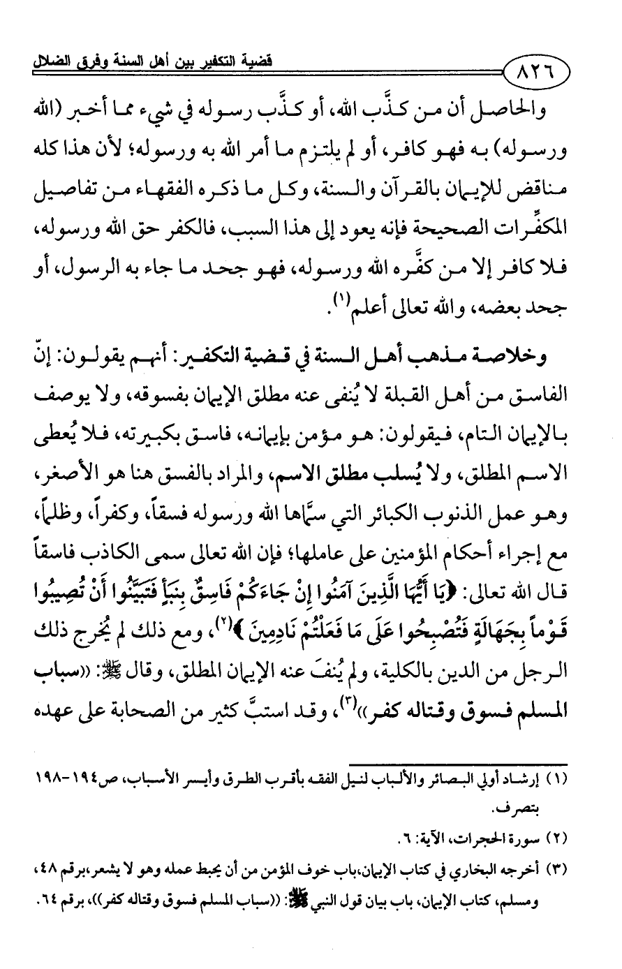 وخلاصة مذهب أهل السنة في قضية التكفير: أنهم يقولون: إنّ الفاسق من أهل القبلة لا يُنفى عنه مطلق الإيمان بفسوقه، ولا يوصف بالإيمان التام، فيقولون: هو مؤمن بإيمانه، فاسق بكبيرته، فلا يُعطى الاسم المطلق، ولا يُسلب مطلق الاسم، والمراد بالفسق هنا هو الأصغر، وهو عمل الذنوب الكبائر التي سمَّاها الله ورسوله فسقاً، وكفراً، وظلماً، مع إجراء أحكام المؤمنين على عاملها؛ فإن الله تعالى سمى الكاذب فاسقاً قال الله تعالى: {يَا أَيُّهَا الَّذِينَ آمَنُوا إِنْ جَاءَكُمْ فَاسِقٌ بِنَبَأٍ فَتَبَيَّنُوا أَنْ تُصِيبُوا قَوْماً بِجَهَالَةٍ فَتُصْبِحُوا عَلَى مَا فَعَلْتُمْ نَادِمِينَ} (¬2)، ومع ذلك لم يُخرج ذلك الرجل من الدين بالكلية، ولم يُنفَ عنه الإيمان المطلق، وقال - صلى الله عليه وسلم -: ((سباب المسلم فسوق وقتاله كفر)) (¬3)، وقد استبَّ كثير من الصحابة على عهده
