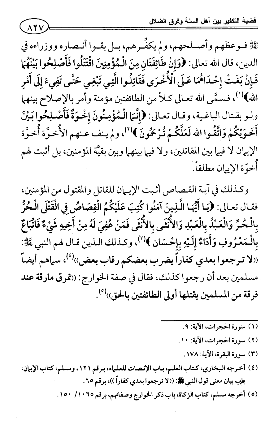 وكذلك في آية القصاص أثبت الإيمان للقاتل والمقتول من المؤمنين، فقال تعالى: {يَا أَيُّهَا الَّذِينَ آمَنُوا كُتِبَ عَلَيْكُمُ الْقِصَاصُ فِي الْقَتْلَى الْحُرُّ بِالْحُرِّ وَالْعَبْدُ بِالْعَبْدِ وَالأُنْثَى بِالأُنْثَى فَمَنْ عُفِيَ لَهُ مِنْ أَخِيهِ شَيْءٌ فَاتِّبَاعٌ بِالْمَعْرُوفِ وَأَدَاءٌ إِلَيْهِ بِإِحْسَان} (¬3)، وكذلك الذين قال لهم النبي - صلى الله عليه وسلم -: ((لا ترجعوا بعدي كفاراً يضرب بعضكم رقاب بعض)) (¬4)، سماهم أيضاً مسلمين بعد أن رجعوا كذلك، فقال في صفة الخوارج: ((تمرق مارقة عند فرقة من المسلمين يقتلها أولى الطائفتين بالحق)) (¬5).