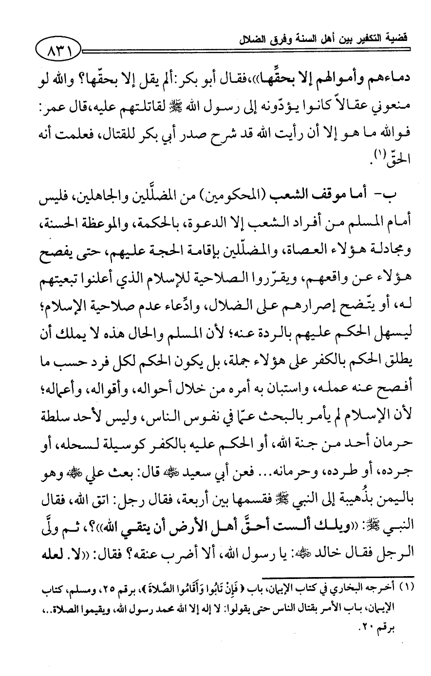 (¬1) أخرجه البخاري في كتاب الإيمان، باب {فَإِنْ تَابُوا وَأَقَامُوا الصَّلاةَ}، برقم 25، ومسلم، كتاب الإيمان، باب الأمر بقتال الناس حتى يقولوا: لا إله إلا الله محمد رسول الله، ويقيموا الصلاة .. ، برقم 20.