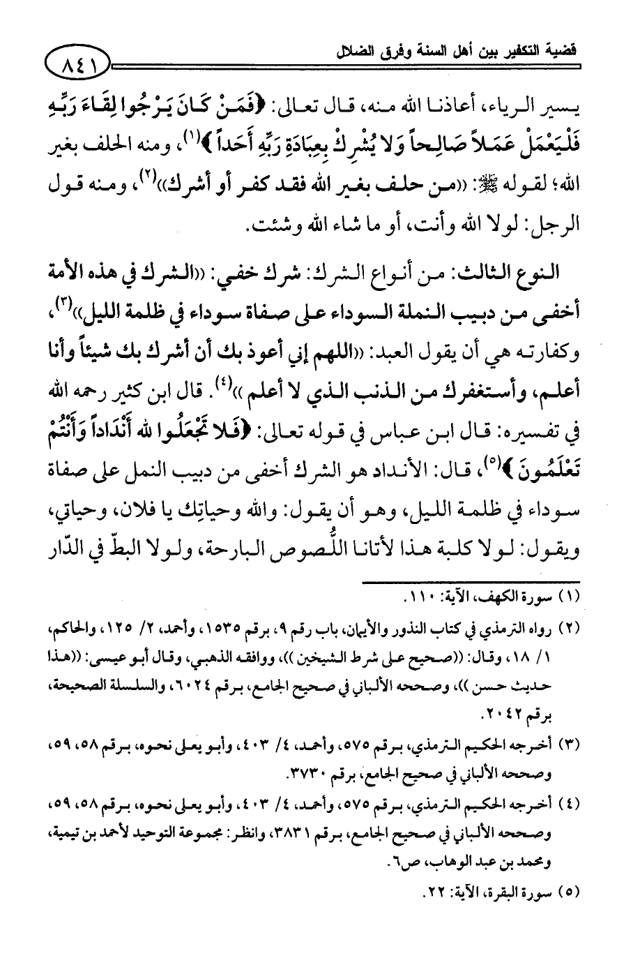 النوع الثالث: من أنواع الشرك: شرك خفي: ((الشرك في هذه الأمة أخفى من دبيب النملة السوداء على صفاة سوداء في ظلمة الليل)) (¬3)، وكفارته هي أن يقول العبد: ((اللهم إني أعوذ بك أن أشرك بك شيئاً وأنا أعلم، وأستغفرك من الذنب الذي لا أعلم)) (¬4). قال ابن كثير رحمه الله في تفسيره: قال ابن عباس في قوله تعالى: {فَلا تَجْعَلُوا لله أَنْدَاداً وَأَنْتُمْ تَعْلَمُونَ} (¬5)، قال: الأنداد هو الشرك أخفى من دبيب النمل على صفاة سوداء في ظلمة الليل، وهو أن يقول: والله وحياتِك يا فلان، وحياتي، ويقول: لولا كلبة هذا لأتانا اللُّصوص البارحة، ولولا البطّ في الدّار