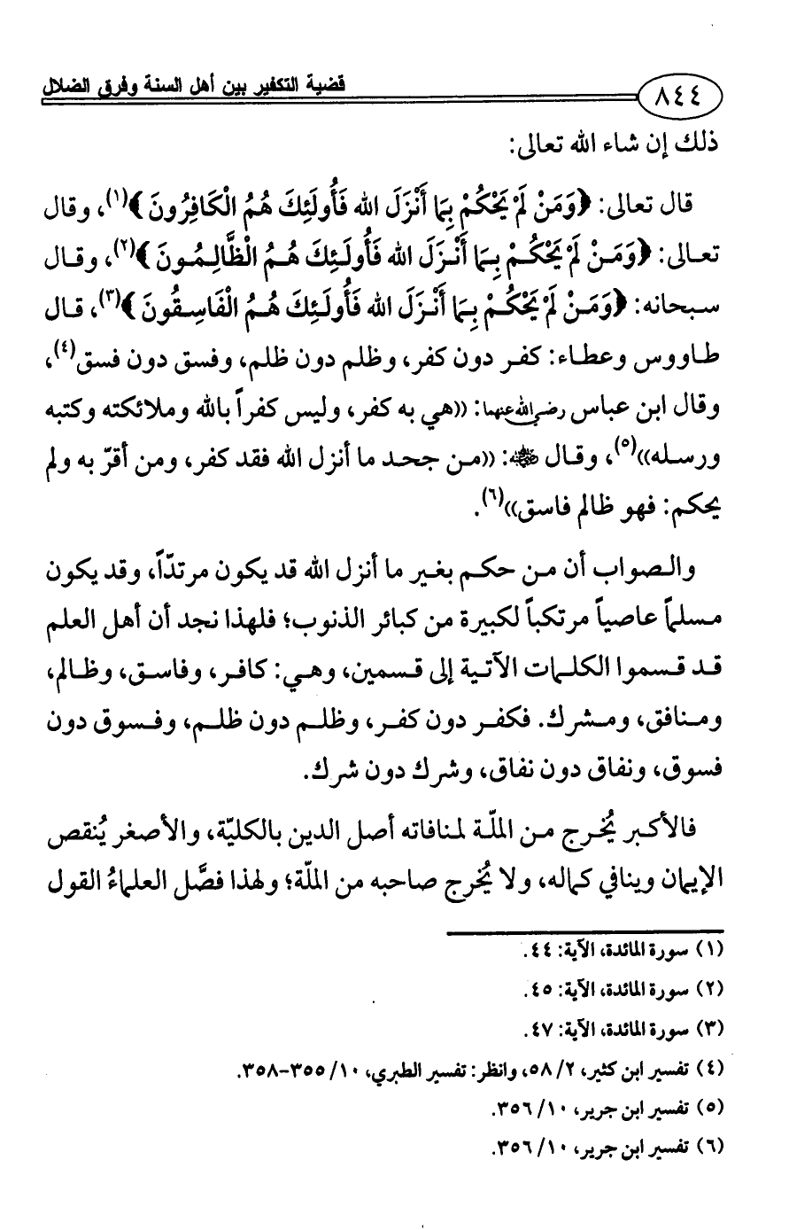 قال تعالى: {وَمَنْ لَمْ يَحْكُمْ بِمَا أَنْزَلَ الله فَأُولَئِكَ هُمُ الْكَافِرُونَ} (¬1)، وقال تعالى: {وَمَنْ لَمْ يَحْكُمْ بِمَا أَنْزَلَ الله فَأُولَئِكَ هُمُ الْظَّالِمُونَ} (¬2)، وقال سبحانه: {وَمَنْ لَمْ يَحْكُمْ بِمَا أَنْزَلَ الله فَأُولَئِكَ هُمُ الْفَاسِقُونَ} (¬3)، قال طاووس وعطاء: كفر دون كفر، وظلم دون ظلم، وفسق دون فسق (¬4)، وقال ابن عباس رضي الله عنهما: ((هي به كفر، وليس كفراً بالله وملائكته وكتبه ورسله)) (¬5)، وقال - رضي الله عنه -: ((من جحد ما أنزل الله فقد كفر، ومن أقرّ به ولم يحكم: فهو ظالم فاسق)) (¬6).