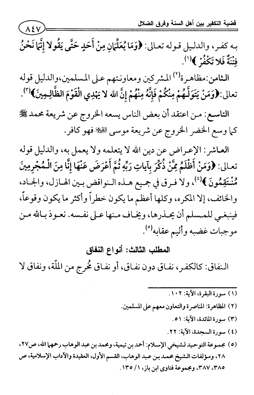 (¬5) مجموعة التوحيد لشيخي الإسلام: أحمد بن تيمية، ومحمد بن عبد الوهاب رحمهما الله، ص27، 28، ومؤلفات الشيخ محمد بن عبد الوهاب، القسم الأول، العقيدة والآداب الإسلامية، ص385، 387، ومجموعة فتاوى ابن باز، 1/ 135.