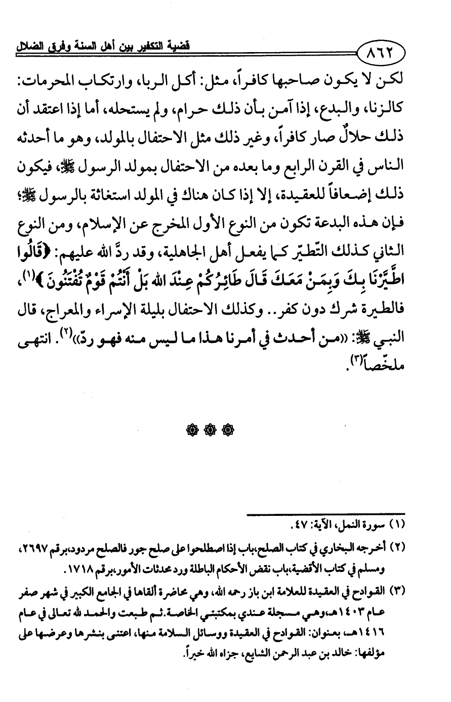 لكن لا يكون صاحبها كافراً، مثل: أكل الربا، وارتكاب المحرمات: كالزنا، والبدع، إذا آمن بأن ذلك حرام، ولم يستحله، أما إذا اعتقد أن ذلك حلالٌ صار كافراً، وغير ذلك مثل الاحتفال بالمولد، وهو ما أحدثه الناس في القرن الرابع وما بعده من الاحتفال بمولد الرسول - صلى الله عليه وسلم -، فيكون ذلك إضعافاً للعقيدة، إلا إذا كان هناك في المولد استغاثة بالرسول - صلى الله عليه وسلم -، فإن هذه البدعة تكون من النوع الأول المخرج عن الإسلام، ومن النوع الثاني كذلك التّطيّر كما يفعل أهل الجاهلية، وقد ردَّ الله عليهم: {قَالُوا اطَّيَّرْنَا بِكَ وَبِمَنْ مَعَكَ قَالَ طَائِرُكُمْ عِنْدَ الله بَلْ أَنْتُمْ قَوْمٌ تُفْتَنُونَ} (¬1)، فالطيرة شرك دون كفر .. وكذلك الاحتفال بليلة الإسراء والمعراج، قال النبي - صلى الله عليه وسلم -: ((من أحدث في أمرنا هذا ما ليس منه فهو ردّ)) (¬2). انتهى ملخّصاً (¬3).