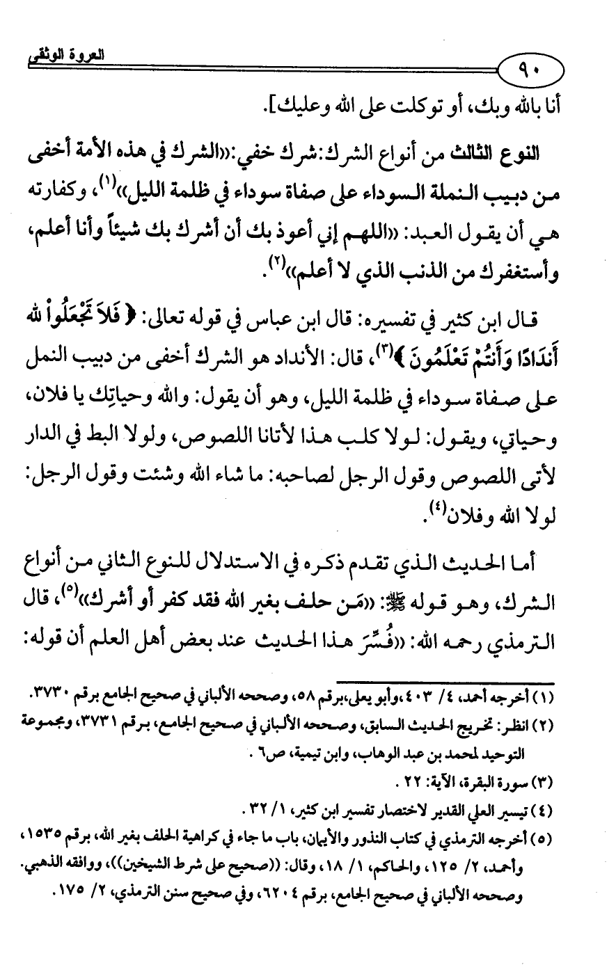 أما الحديث الذي تقدم ذكره في الاستدلال للنوع الثاني من أنواع الشرك، وهو قوله - صلى الله عليه وسلم -: ((مَن حلف بغير الله فقد كفر أو أشرك)) (¬5)، قال الترمذي رحمه الله: ((فُسِّرَ هذا الحديث عند بعض أهل العلم أن قوله: