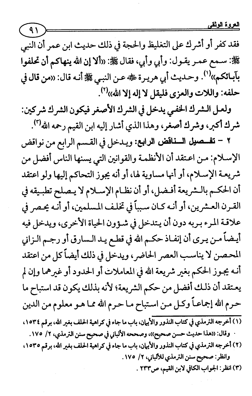 2 - تفصيل الناقض الرابع: ويدخل في القسم الرابع من نواقض الإسلام: من اعتقد أن الأنظمة والقوانين التي يسنها الناس أفضل من شريعة الإسلام، أو أنها مساوية لها، أو أنه يجوز التحاكم إليها ولو اعتقد أن الحكم بالشريعة أفضل، أو أن نظام الإسلام لا يصلح تطبيقه في القرن العشرين، أو أنه كان سبباً في تخلف المسلمين، أو أنه يحصر في علاقة المرء بربه دون أن يتدخل في شؤون الحياة الأخرى، ويدخل فيه أيضاً من يرى أن إنفاذ حكم الله في قطع يد السارق أو رجم الزاني المحصن لا يناسب العصر الحاضر، ويدخل في ذلك أيضاً كل من اعتقد أنه يجوز الحكم بغير شريعة الله في المعاملات أو الحدود أو غيرهما وإن لم يعتقد أن ذلك أفضل من حكم الشريعة؛ لأنه بذلك يكون قد استباح ما حرم الله إجماعاً وكل من استباح ما حرم الله مما هو معلوم من الدين