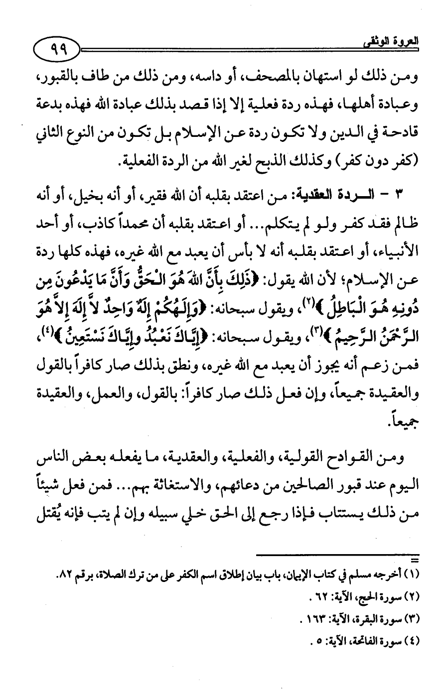 3 - الردة العقدية: من اعتقد بقلبه أن الله فقير، أو أنه بخيل، أو أنه ظالم فقد كفر ولو لم يتكلم ... أو اعتقد بقلبه أن محمداً كاذب، أو أحد الأنبياء، أو اعتقد بقلبه أنه لا بأس أن يعبد مع الله غيره، فهذه كلها ردة عن الإسلام؛ لأن الله يقول: {ذَلِكَ بِأَنَّ الله هُوَ الْحَقُّ وَأَنَّ مَا يَدْعُونَ مِن دُونِهِ هُوَ الْبَاطِلُ} (¬1)، ويقول سبحانه: {وَإِلَهُكُمْ إِلَهٌ وَاحِدٌ لاَّ إِلَهَ إِلاَّ هُوَ الرَّحْمَنُ الرَّحِيمُ} (¬2)، ويقول سبحانه: {إِيَّاكَ نَعْبُدُ وإِيَّاكَ نَسْتَعِينُ} (¬3)، فمن زعم أنه يجوز أن يعبد مع الله غيره، ونطق بذلك صار كافراً بالقول والعقيدة جميعاً، وإن فعل ذلك صار كافراً: بالقول، والعمل، والعقيدة جميعاً.