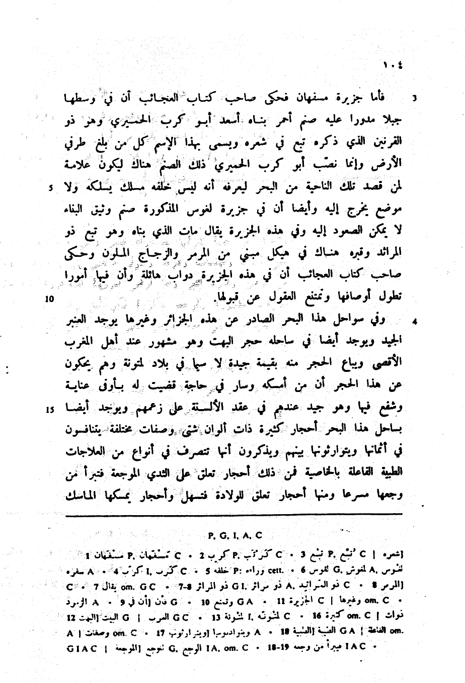 فأما جزيرة مسفهان فحكى صاحب كتاب العجائب أن في وسطها جبلا مدورا عليه صنم أحمر بناه أسعد أبو كرب الحميري وهو ذو القرنين الذي ذكره تبع في شعره ويسمى بهذا الطسم كل من بلغ طرفي الأرض وإنما نصّب أبو كرب الحميري ذلك الصنم هناك ليكون علامة لمن قصد تلك الناحية من البحر ليعرفه أنه ليس خلفه مسلك يسلكه ولا موضع يخرج إليه وأيضا أن في جزيرة لغوس المذكورة صنم وثيق البناء لا يمكن الصعود إليه وفي هذه الجزيرة يقال مات الذي بناه وهو تبع ذو المرائد وقبره هناك في هيكل مبني من المرمر والزجاج الملون وحكى صاحب كتاب العجائب أن في هذه الجزيرة دواب هائلة وأن فيها أمورا تطول أوصافها وتمتنع العقول عن قبولها.