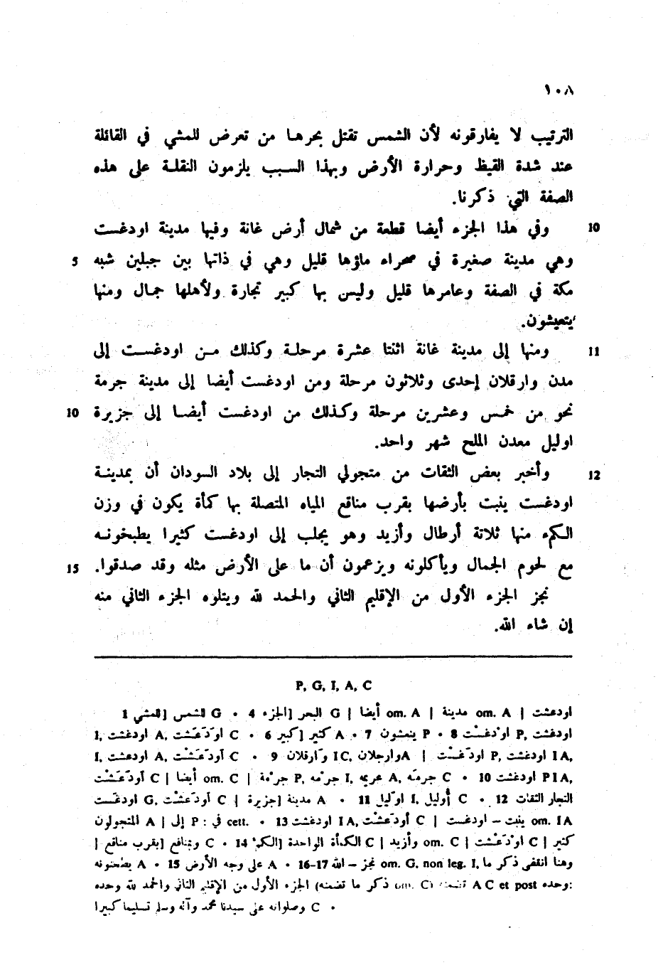 ومنها إلى مدينة غانة اثنتا عشرة مرحلة وكذلك من اودغست إلى مدن وارقلان إحدى وثلاثون مرحلة ومن اودغست أيضا إلى مدينة جرمة نحو من خمس وعشرين مرحلة وكذلك من اودغست أيضا إلى جزيرة اوليل معدن الملح شهر واحد.