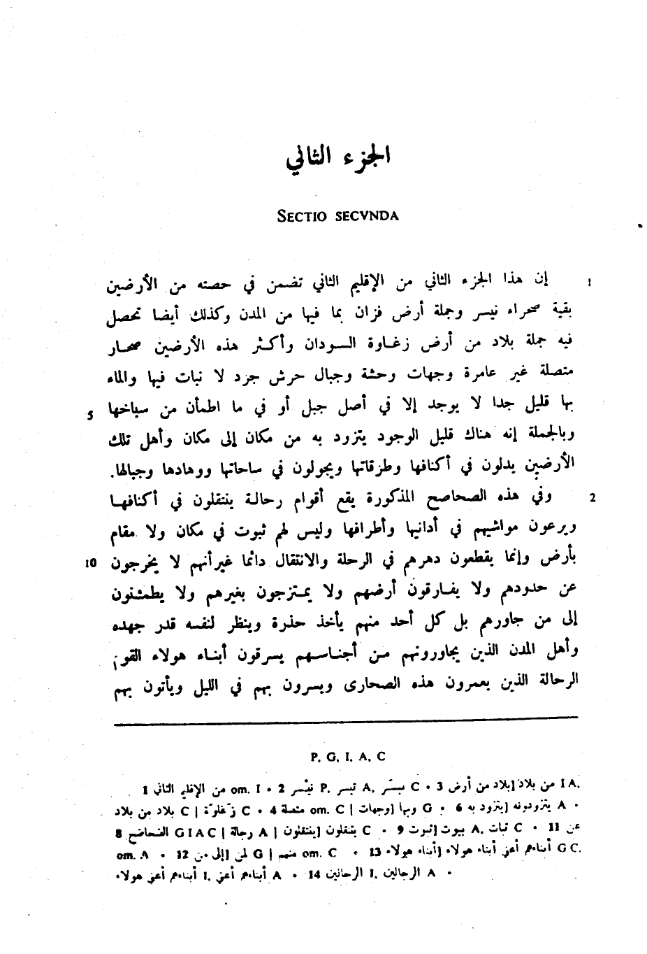 إن هذا الجزء الثاني من الإقليم الثاني تضمن في حصته من الأرضين بقية صحراء نيسر وجملة أرض فزان بما فيها من المدن وكذلك أيضا تحصل فيه جملة بلاد من أرض زغاوة السودان وأكثر هذه الأرضين صحار متصلة غير عامرة وجهات وحشة وجبال حرش جرد لا نبات فيها والماء بها قليل جدا لا يوجد إلا في أصل جبل أو في ما اطمأن من سباخها وبالجملة إنه هناك قليل الوجود يتزود به من مكان إلى مكان وأهل تلك الأرضين يدلون في أكنافها وطرقاتها ويجولون في ساحاتها ووهادها وجبالها.