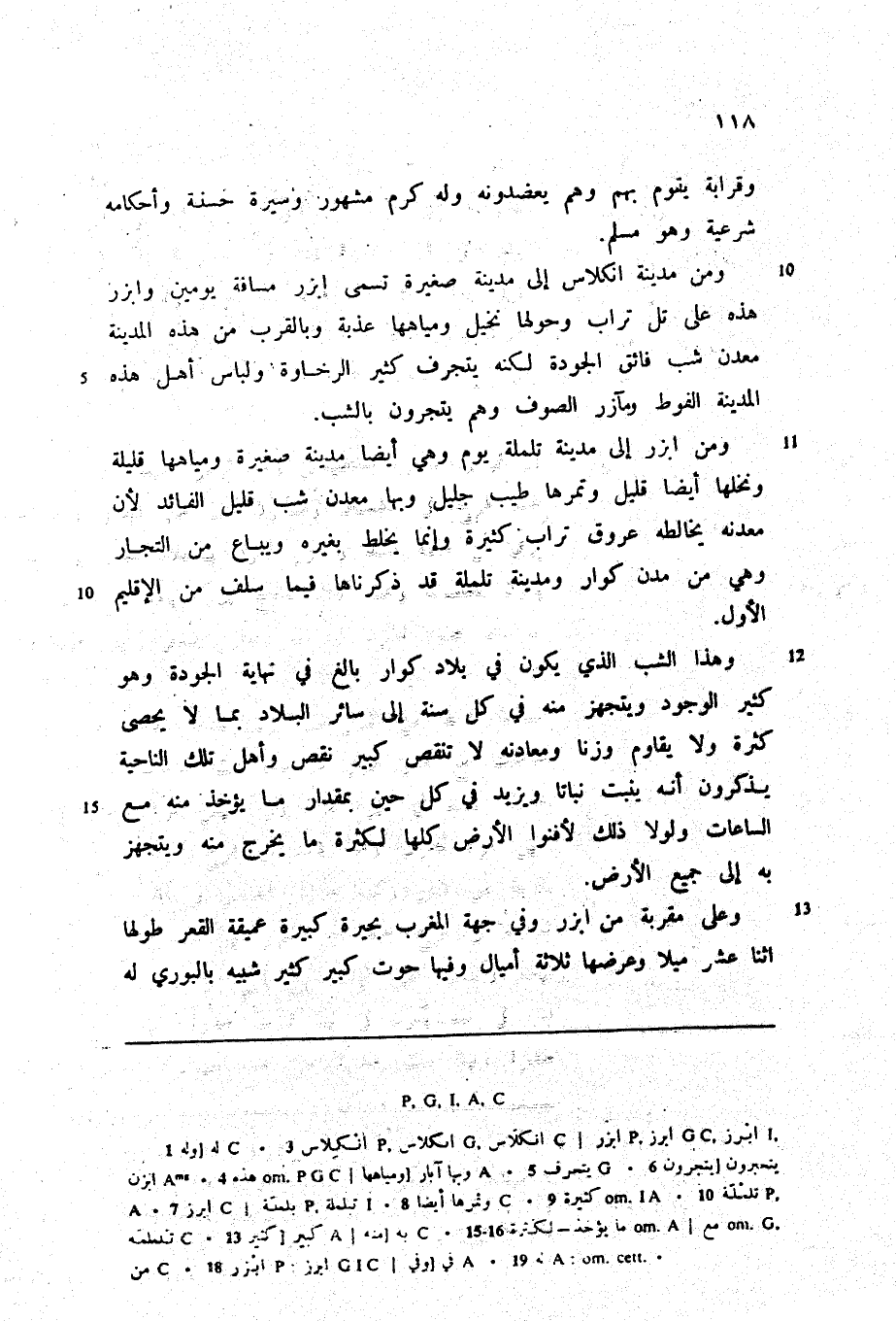ومن مدينة انكلاس إلى مدينة صغيرة تسمى ابزر مسافة يومين وابزر هذه على تل تراب وحولها نخيل ومياهها عذبة وبالقرب من هذه المدينة معدن شب فائق الجودة لكنه يتجرف كثير الرخاوة ولباس أهل هذه المدينة الفوط ومآزر الصوف وهم يتجرون بالشب.