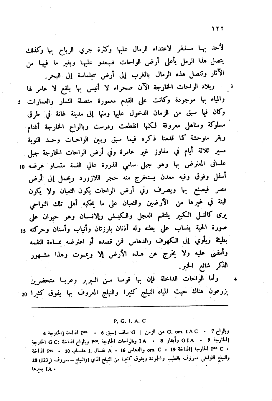 وبلاد الواحات الخارجة الآن صحراء لا أنيس بها بلقع لا عامر لها والمياه بها موجودة وكانت على القدم معمورة متصلة الثمار والعمارات وكان فيما سبق من الزمان الدخول عليها ومنها إلى مدينة غانة في طرق مسلوكة ومناهل معروفة لكنها انقطعت ودرست وبالواح. الخارجة أغنام وبقر متوحشة كما قدمنا ذكره فيما سبق وبين الواحات وحد النوبة مسير ثلاثة أيام في مفاوز غير عامرة وفي أرض الواحات الخارجة جبل علسانى المعترض بها وهو جبل سامي الذروة عالي القمة متساو عرضه أسفل وفوق وفيه معدن يستخرج منه حجر اللازورد ويحمل إلى أرض مصر فيصنع بها ويصرف وفي أرض الواحات يكون الثعبان ولا يكون البتة في غيرها من الأرضين والثعبان على ما يحكيه أهل تلك النواحي يرى كالتل الكبير يلتقم العجل والكبش والإنسان وهو حيوان على صورة الحية ينساب على بطنه وله أذنان بارزتان وأنياب وأسنان وحركته بطيئة ويأوي إلى الكهوف والدهاس فمن قصده أو اعترضه بمساءة التقمه وأمضى عليه ولا يخرج عن هذه الأرض إلا ويموت وهذا مشهور الذكر شائع الخبر.
