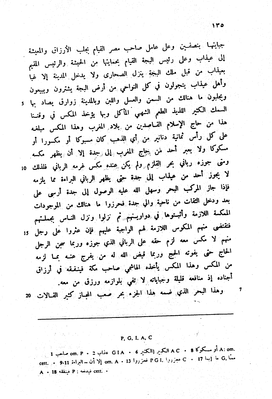 جبايتها بنصفين وعلى عامل صاحب مصر القيام بجلب الأرزاق والمعيشة إلى عيذاب وعلى رئيس البجة القيام بحمايتها من الحبشة والرئيس المقيم بعيذاب من قبل ملك البجة ينزل الصحارى ولا يدخل المدينة إلا غبا وأهل عيذاب يتجولون في كل النواحي من أرض البجة يشترون ويبيعون ويجلبون ما هنالك من السمن والعسل واللبن وبالمدينة زوارق يصاد بها السمك الكثير اللذيذ الطعم الشهي المأكل وبها يؤخذ المكس في وقتنا هذا من حاج الإسلام القاصدين من بلاد المغرب وهذا المكس مبلغه على كل رأس ثمانية دنانير من أي الذهب كان مسبوكا أو مكسورا أو مسكوكا ولا يعبر أحد من حاج المغرب إلى جدة إلا أن يظهر مكسه ومتى جوزه رباني بحر القلزم ولم يكن عنده مكس غرمه الرباني فلذلك لا يجوز أحد من عيذاب إلى جدة حتى يظهر الرباني البراءة مما يلزمه فإذا جاز المركب البحر وسهل الله عليه الوصول إلى جدة أرسى على بعد ودخل الثقات من ناحية والي جدة فحرزوا ما هنالك من الموجودات الممكسة اللازمة وأثبتوها في دواوينهم ثم نزلوا ونزل الناس بجملتهم فتقتضى منهم المكوس اللازمة لهم الواجبة عليهم فإن عثروا على رجل منهم لا مكس معه لزم حقه على الرباني الذي جوزه وربما سجن الرجل الحاج حتى يفوته الحج وربما قيض الله له من يفرج عنه بما لزمه من المكس وهذا المكس يأخذه الهاشمي صاحب مكة فينفقه في أرزاق أجناده إذ منافعه قليلة وجباياته لا تفي بلوازمه ورزق من معه.