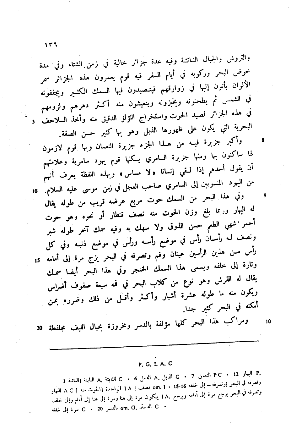 والتروش والجبال الناتئة وفيه عدة جزائر خالية في زمن الشتاء وفي مدة خوض البحر وركوبه في أيام السفر فيه قوم يعمرون هذه الجزائر سمر الألوان يأتون إليها في زوارقهم فيتصيدون فيها السمك الكثير ويجففونه في الشمس ثم يطحنونه ويخبزونه ويتعيشون منه أكثر دهرهم ولزومهم في هذه الجزائر لصيد الحوت واستخراج اللؤلؤ الدقيق منه وأخذ السلاحف البحرية التي يكون على ظهورها الذبل وهو بها كثير حسن الصفة.