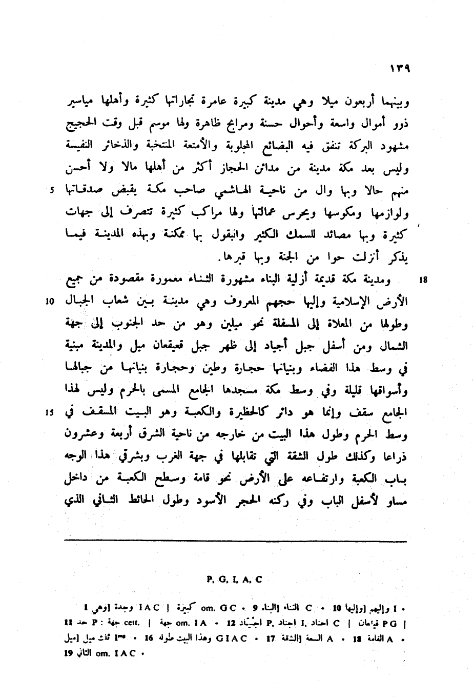 ومدينة مكة قديمة أزلية البناء مشهورة الثناء معمورة مقصودة من جميع الأرض الإسلامية وإليها حجهم المعروف وهي مدينة بين شعاب الجبال وطولها من المعلاة إلى المسفلة نحو ميلين وهو من حد الجنوب إلى جهة الشمال ومن أسفل جبل أجياد إلى ظهر جبل قعيقعان ميل والمدينة مبنية في وسط هذا الفضاء وبنيانها حجارة وطين وحجارة بنيانها من جبالها وأسواقها قليلة وفي وسط مكة مسجدها الجامع المسمى بالحرم وليس لهذا الجامع سقف وإنما هو دائر كالحظيرة والكعبة وهو البيت المسقف في وسط الحرم وطول هذا البيت من خارجه من ناحية الشرق أربعة وعشرون ذراعا وكذلك طول الشقة التي تقابلها في جهة الغرب وبشرقي هذا الوجه باب الكعبة وارتفاعه على الأرض نحو قامة وسطح الكعبة من داخل مساو لأسفل الباب وفي ركنه الحجر الأسود وطول الحائط الثاني الذي