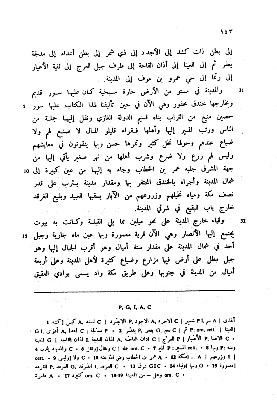 والمدينة في مستو من الأرض حارة سبخية كان عليها سور قديم وبخارجها خندق محفور وهي الآن في حين تأليفنا لهذا الكتاب عليها سور حصين منيع من التراب بناه قسيم الدولة الغازي ونقل إليها جملة من الناس ورتب المير إليها وأهلها فقراء قليلو المال لا صنع لهم ولا ضياع عندهم وحولها نخل كثير وتمرها حسن وبها يتقوتون في معايشهم وليس لهم زرع ولا ضرع وشرب أهلها من نهر صغير يأتي إليها من جهة المشرق جلبه عمر بن الخطاب وجاء به إليها من عين كبيرة إلى شمال المدينة وأجراه بالخندق المحتفر بها ومقدار مدينة يثرب على قدر نصف مكة ومياه نخيلهم وزروعهم من الآبار يسقيها العبيد وبقيع الغرقد خارج باب البقيع في شرقي المدينة.