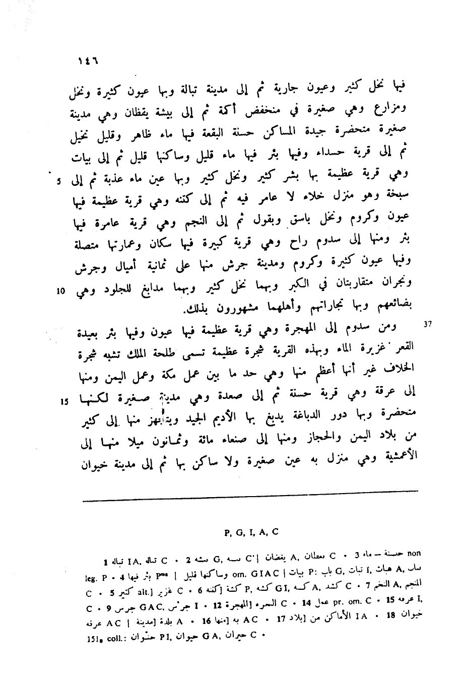 فيها نخل كثير وعيون جارية ثم إلى مدينة تبالة وبها عيون كثيرة ونخل ومزارع وهي صغيرة في منخفض أكمة ثم إلى بيشة يقظان وهي مدينة صغيرة متحضرة جيدة المساكن حسنة البقعة فيها ماء ظاهر وقليل نخيل ثم إلى قرية حسداء وفيها بئر فيها ماء قليل وساكنها قليل ثم إلى بيات وهي قرية عظيمة بها بشر كثير ونخل كثير وبها عين ماء عذبة ثم إلى سبخة وهو منزل خلاء لا عامر فيه ثم إلى كتنه وهي قرية عظيمة فيها عيون وكروم ونخل باسق وبقول ثم إلى النجم وهي قرية عامرة فيها بئر ومنها إلى سدوم راح وهي قرية كبيرة فيها سكان وعمارتها متصلة وفيها عيون كثيرة وكروم ومدينة جرش منها على ثمانية أميال وجرش ونجران متقاربتان في الكبر وبهما نخل كثير وبهما مدابغ للجلود وهي بضائعهم وبها تجاراتهم وأهلهما مشهورون بذلك.