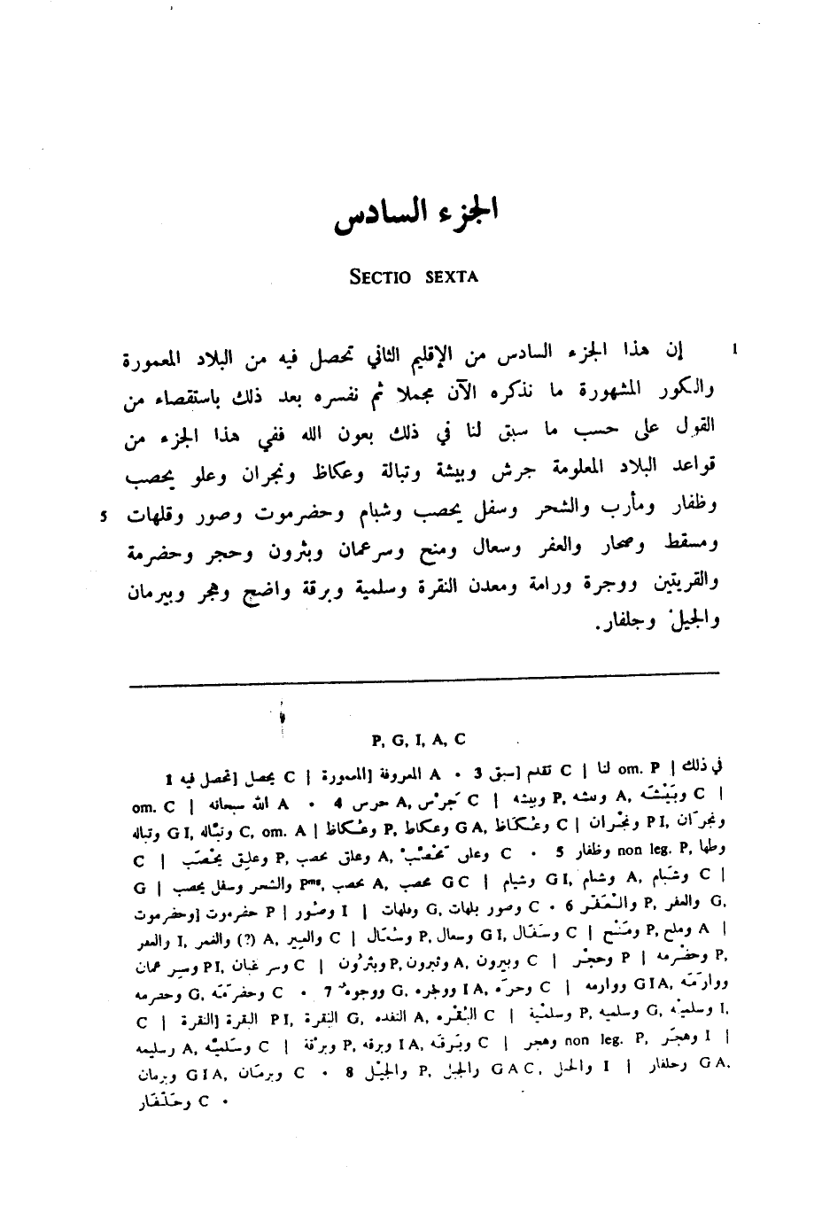 إن هذا الجزء السادس من الإقليم الثاني تحصل فيه من البلاد المعمورة والكور المشهورة ما نذكره الآن مجملا ثم نفسره بعد ذلك باستقصاء من القول على حسب ما سبق لنا في ذلك بعون الله ففي هذا الجزء من قواعد البلاد المعلومة جرش وبيشة وتبالة وعكاظ ونجران وعلو يحصب وظفار ومأرب والشحر وسفل يحصب وشبام وحضرموت وصور وقلهات ومسقط وصحار والعفر وسعال ومنح وسر عمان وبثرون وحجر وحضرمة والقريتين ووجرة ورامة ومعدن النقرة وسلمية وبرقة واضح وهجر وبيرمان والجيل وجلفار.