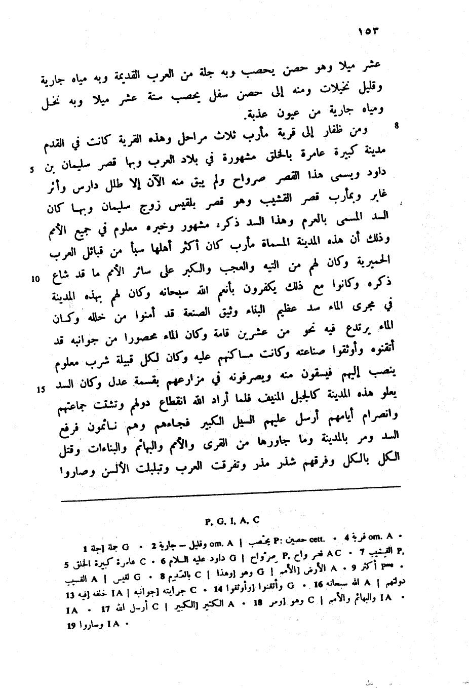 ومن ظفار إلى قرية مأرب ثلاث مراحل وهذه القرية كانت في القدم مدينة كبيرة عامرة بالخلق مشهورة في بلاد العرب وبها قصر سليمان بن داود ويسمى هذا القصر صرواح ولم يبق منه الآن إلا طلل دارس وأثر غابر وبمأرب قصر القشيب وهو قصر بلقيس زوج سليمان وبها كان السد المسمى بالعرم وهذا السد ذكره مشهور وخبره معلوم في جميع الأمم وذلك أن هذه المدينة المسماة مأرب كان أكثر أهلها سبأ من قبائل العرب الحميرية وكان لهم من التيه والعجب والكبر على سائر الأمم ما قد شاع ذكره وكانوا مع ذلك يكفرون بأنعم الله سبحانه وكان لهم بهذه المدينة في مجرى الماء سد عظيم البناء وثيق الصنعة قد أمنوا من خلله وكان الماء يرتدع فيه نحو من عشرين قامة وكان الماء محصورا من جوانبه قد أتقنوه وأوثقوا صناعته وكانت مساكنهم عليه وكان لكل قبيلة شرب معلوم ينصب إليهم فيسقون منه ويصرفونه في مزارعهم بقسمة عدل وكان السد يعلو هذه المدينة كالجبل المنيف فلما أراد الله انقطاع دولهم وتشتت جماعتهم وانصرام أيامهم أرسل عليهم السيل الكبير فجاءهم وهم نائمون فرفع السد ومر بالمدينة وما جاورها من القرى والأمم والبهائم والبناءات وقتل الكل بالكل وفرقهم شذر مذر وتفرقت العرب وتبلبلت الألسن وصاروا