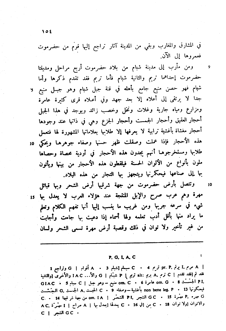 ومن مأرب إلى مدينة شبام من بلاد حضرموت أربع مراحل ومدينتا حضرموت إحداهما تريم والثانية شبام فأما تريم فقد تقدم ذكرها وأما شبام فهو حصن منيع جامع بأهله في قنة جبل شبام وهو جبل منيع جدا لا يرتقى إلى أعلاه إلا بعد جهد وفي أعلاه قرى كثيرة عامرة ومزارع ومياه جارية وغلات ونخل وخصب زائد ويوجد في هذا الجبل أحجار العقيق وأحجار الجمست وأحجار الجزع وهي في ذاتها عند وجودها أحجار مغشاة بأغشية ترابية لا يعرفها إلا طلابها بعلاماتها المشهورة لها فتعمل هذه الأحجار فإذا عملت وصقلت ظهر حسنها وصفاء جوهرها ويحكي طلابها ومستخرجوها أنهم يجدون هذه الأحجار في أودية محصاة وحصاها ملون بأنواع من الألوان الحسنة فيلقطون هذه الأحجار من بينها ويأتون بها إلى صناعها فيحكمونها ويتجهز بها التجار من هذه البلاد.