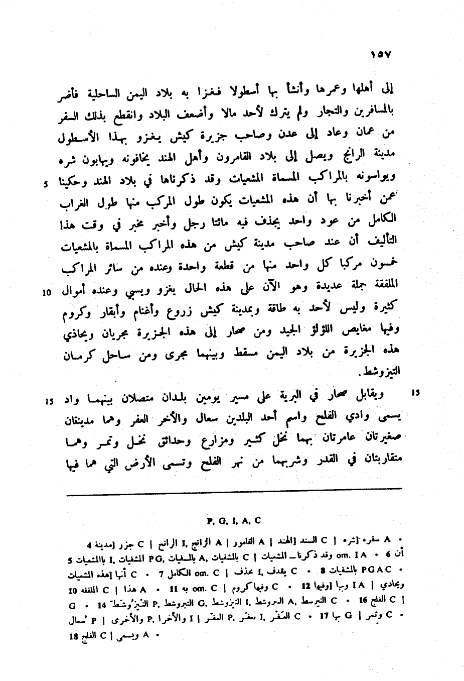 إلى أهلها وعمرها وأنشأ بها أسطولا فغزا به بلاد اليمن الساحلية فأضر بالمسافرين والتجار ولم يترك لأحد مالا وأضعف البلاد وانقطع بذلك السفر من عمان وعاد إلى عدن وصاحب جزيرة كيش يغزو بهذا الأسطول مدينة الرانج ويصل إلى بلاد القامرون وأهل الهند يخافونه ويهابون شره ويواسونه بالمراكب المسماة المشعيات وقد ذكرناها في بلاد الهند وحكينا عمن أخبرنا بها أن هذه المشعيات يكون طول المركب منها طول الغراب الكامل من عود واحد يجذف فيه مائتا رجل وأخبر مخبر في وقت هذا التأليف أن عند صاحب مدينة كيش من هذه المراكب المسماة بالمشعيات خمسون مركبا كل واحد منها من قطعة واحدة وعنده من سائر المراكب الملفقة جملة عديدة وهو الآن على هذه الحال يغزو ويسبي وعنده أموال كثيرة وليس لأحد به طاقة وبمدينة كيش زروع وأغنام وأبقار وكروم وفيها مغايض اللؤلؤ الجيد ومن صحار إلى هذه الجزيرة مجريان ويحاذي هذه الجزيرة من بلاد اليمن مسقط وبينهما مجرى ومن ساحل كرمان التيزوشط.
