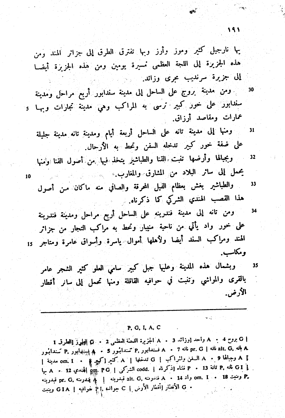 بها نارجيل كثير وموز وأرز وبها تفترق الطرق إلى جزائر الهند ومن هذه الجزيرة إلى اللجة العظمى مسيرة يومين ومن هذه الجزيرة أيضا إلى جزيرة سرنديب مجرى وزائد.