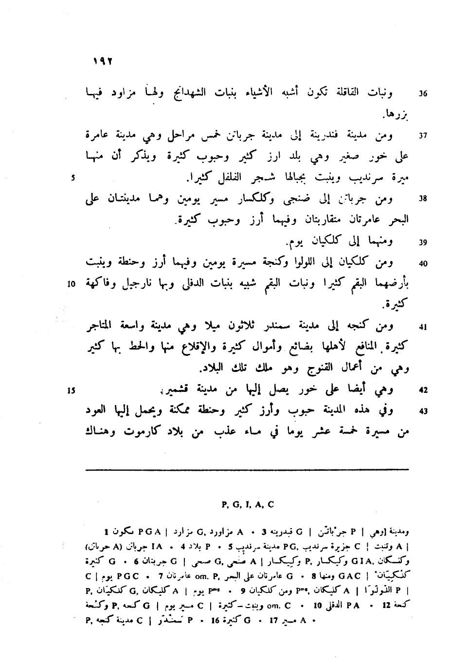 ومن كلكيان إلى اللولوا وكنجة مسيرة يومين وفيهما أرز وحنطة وينبت بأرضهما البقم كثيرا ونبات البقم شبيه بنبات الدفلى وبها نارجيل وفاكهة كثيرة.
