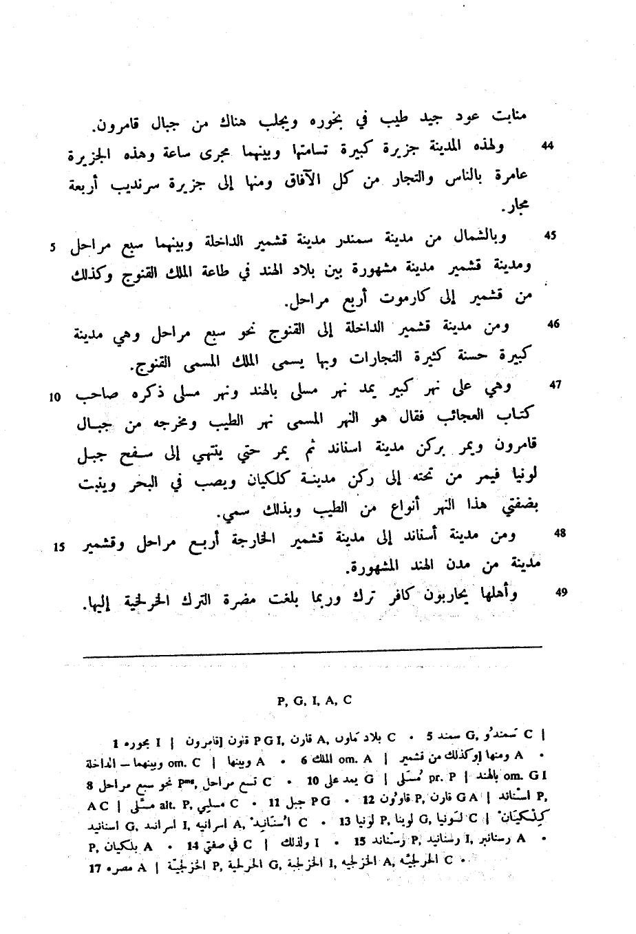 ومن مدينة قشمير الداخلة إلى القنوج نحو سبع مراحل وهي مدينة كبيرة حسنة كثيرة التجارات وبها يسمى الملك المسمى القنوج.