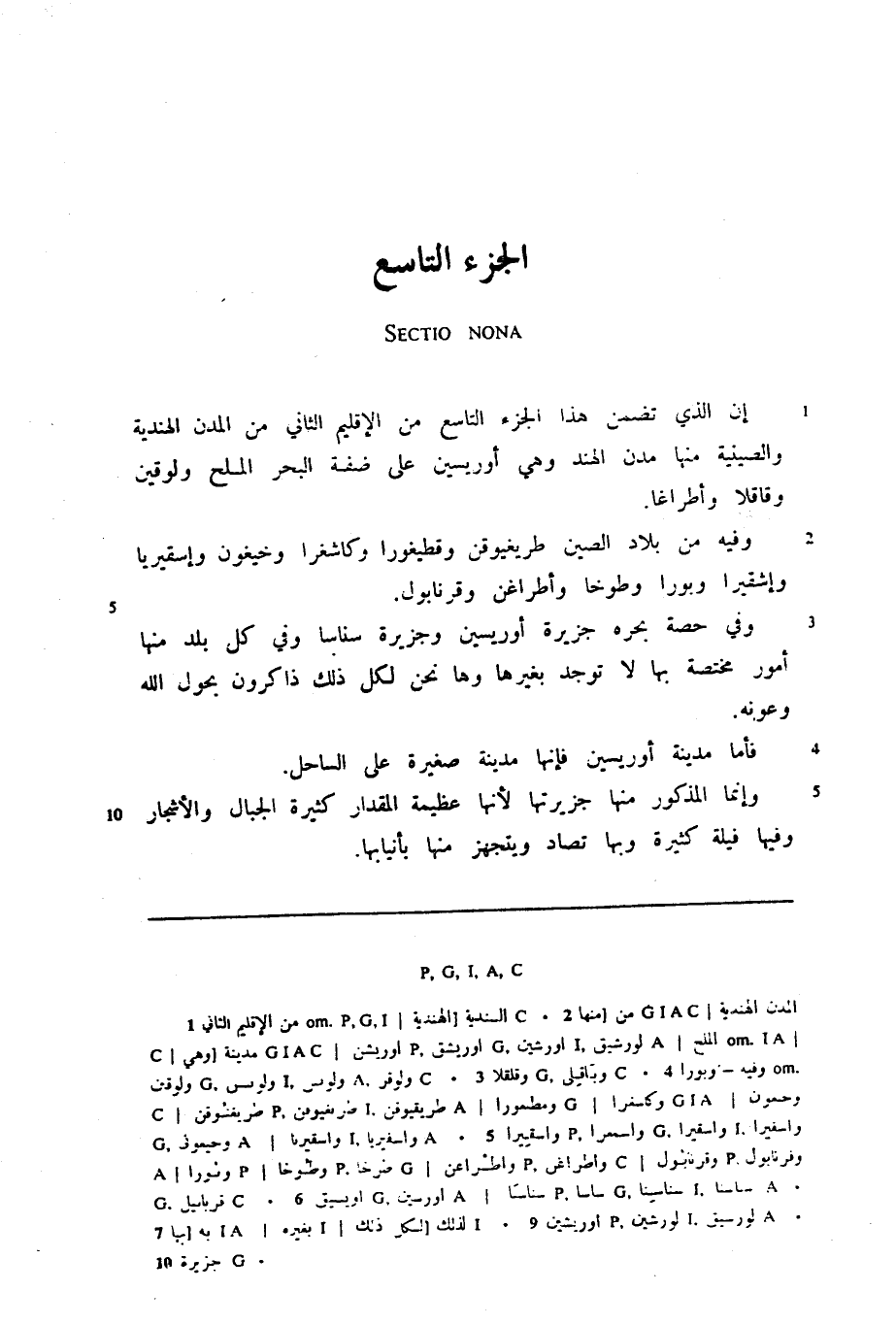 إن الذي تضمن هذا الجزء التاسع من الإقليم الثاني من المدن الهندية والصينية منها مدن الهند وهي أوريسين على ضفة البحر الملح ولوقين وقاقلا وأطراغا.
