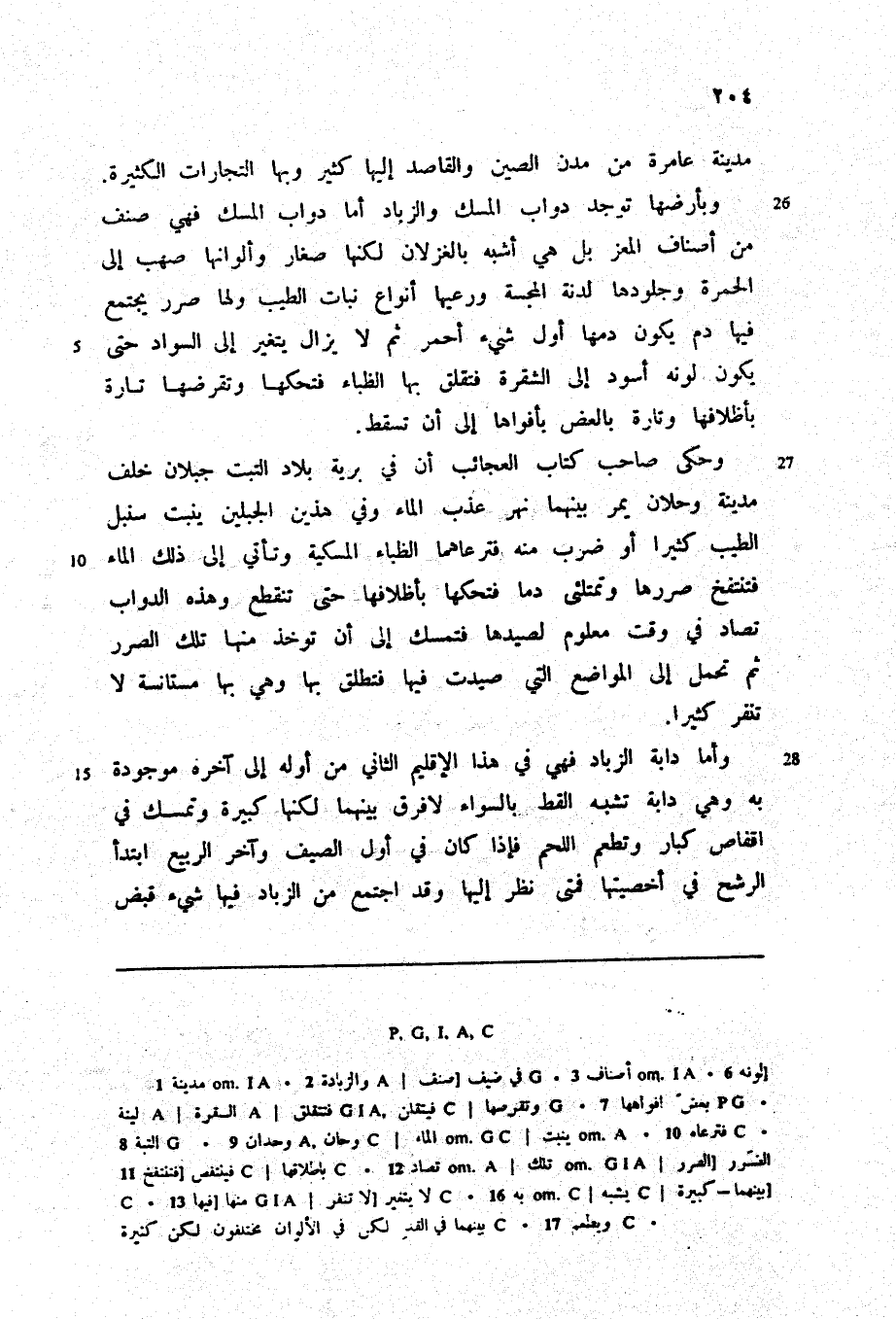 وأما دابة الزباد فهي في هذا الإقليم الثاني من أوله إلى آخره موجودة به وهي دابة تشبه القط بالسواء لا فرق بينهما لكنها كبيرة وتمسك في اقفاص كبار وتطعم اللحم فإذا كان في أول الصيف وآخر الربيع ابتدأ الرشح في أخصيتها فمتى نظر إليها وقد اجتمع من الزباد فيها شيء قبض