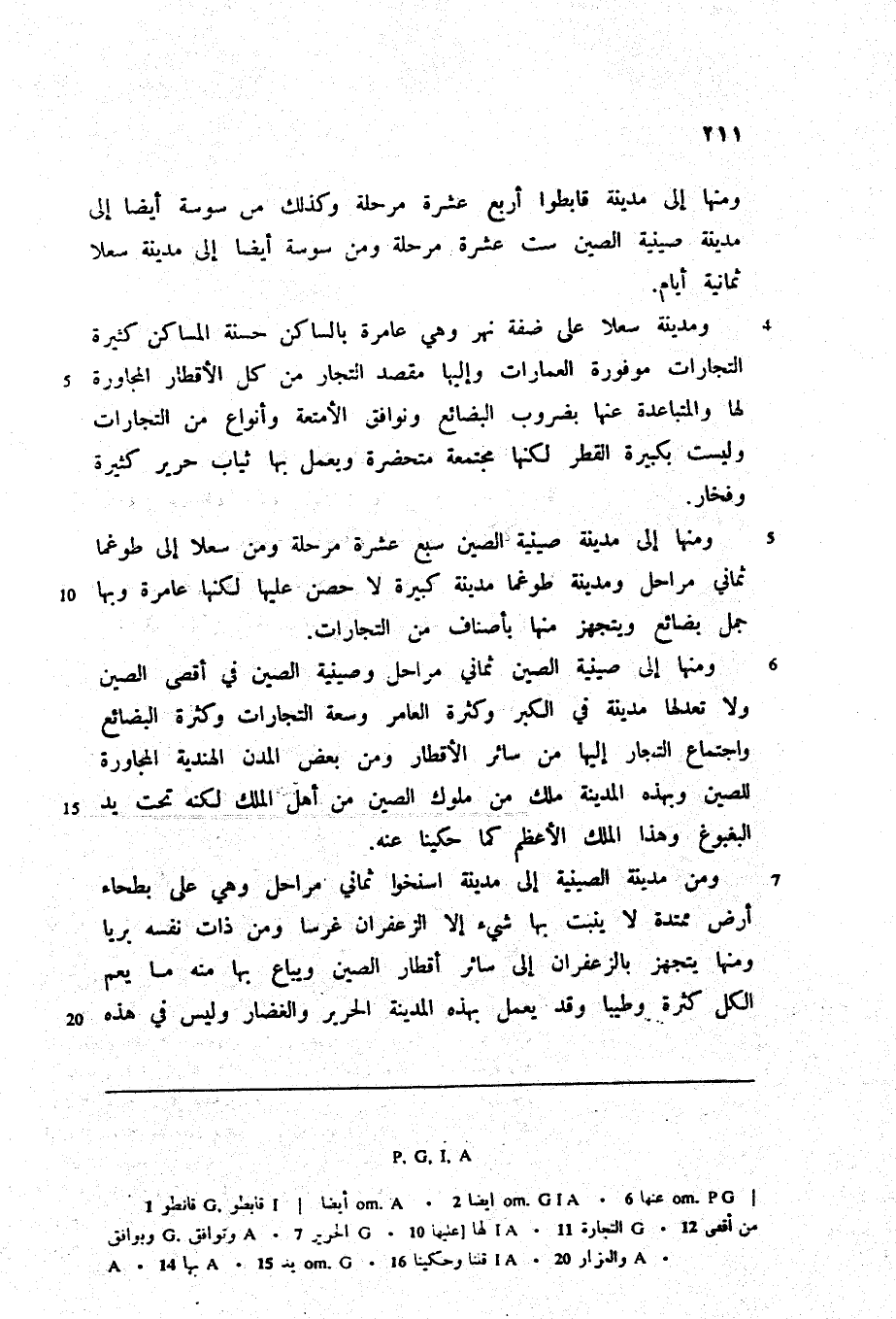 ومنها إلى مدينة صينية الصين سبع عشرة مرحلة ومن سعلا إلى طوغما ثماني مراحل ومدينة طوغما مدينة كبيرة لا حصن عليها لكنها عامرة وبها جمل بضائع ويتجهز منها بأصناف من التجارات.
