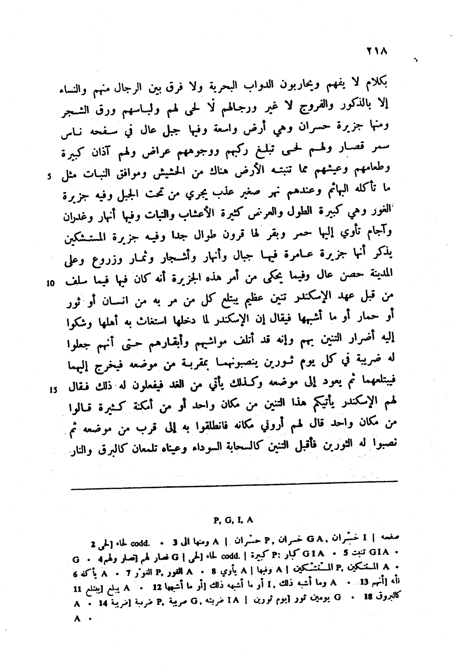 بكلام لا يفهم ويحاربون الدواب البحرية ولا فرق بين الرجال منهم والنساء إلا بالذكور والفروج لا غير ورجالهم لا لحى لهم ولباسهم ورق الشجر ومنها جزيرة حسران وهي أرض واسعة وفيها جبل عال في سفحه ناس سمر قصار ولهم لحى تبلغ ركبهم ووجوههم عراض ولهم آذان كبيرة وطعامهم وعيشهم مما تنبته الأرض هناك من الحشيش وموافق النبات مثل ما تأكله البهائم وعندهم نهر صغير عذب يجري من تحت الجبل وفيه جزيرة الغور وهي كبيرة الطول والعرض كثيرة الأعشاب والنبات وفيها أنهار وغدران وآجام تأوي إليها حمر وبقر لها قرون طوال جدا وفيه جزيرة المستشكين يذكر أنها جزيرة عامرة فيها جبال وأنهار وأشجار وثمار وزروع وعلى المدينة حصن عال وفيما يحكى من أمر هذه الجزيرة أنه كان فيها فيما سلف من قبل عهد الإسكندر تنين عظيم يبتلع كل من مر به من انسان أو ثور أو حمار أو ما أشبهها فيقال إن الإسكندر لما دخلها استغاث به أهلها وشكوا إليه أضرار التنين بهم وإنه قد أتلف مواشيهم وأبقارهم حتى أنهم جعلوا له ضريبة في كل يوم ثورين ينصبونهما بمقربة من موضعه فيخرج إليهما فيبتلعهما ثم يعود إلى موضعه وكذلك يأتي من الغد فيفعلون له ذلك فقال لهم الإسكندر يأتيكم هذا التنين من مكان واحد أو من أمكنة كثيرة قالوا من مكان واحد قال لهم أروني مكانه فانطلقوا به إلى قرب من موضعه ثم نصبوا له الثورين فأقبل التنين كالسحابة السوداء وعيناه تلمعان كالبرق والنار