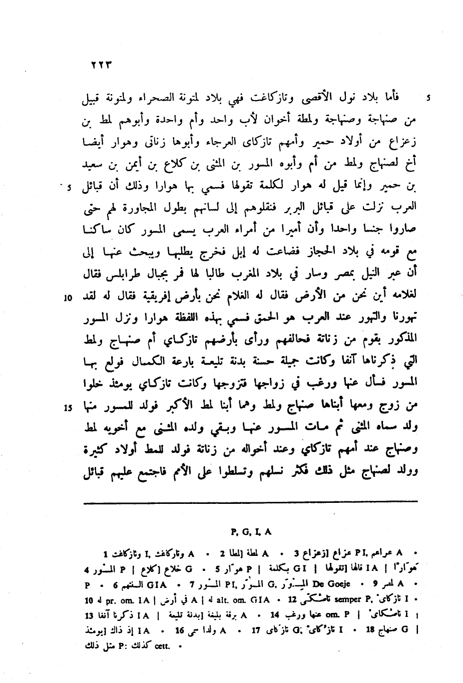 فآما بلاد نول الأقصى وتازكاغت فهي بلاد لمتونة الصحراء ولمتونة قبيل من صنهاجة وصنهاجة ولمطة أخوان لأب واحد وأم واحدة وأبوهم لمط بن زعزاع من أولاد حمير وأمهم تازكاى العرجاء وأبوها زناتى وهوار أيضا أخ لصنهاج ولمط من أم وأبوه المسور بن المثنى بن كلاع بن أيمن بن سعيد بن حمير وإنما قيل له هوار لكلمة تقولها فسمي بها هوارا وذلك أن قبائل العرب نزلت على قبائل البربر فنقلوهم إلى لسانهم بطول المجاورة لهم حتى صاروا جنسا واحدا وأن أميرا من أمراء العرب يسمى المسور كان ساكنا مع قومه في بلاد الحجاز فضاعت له إبل فخرج يطلبها ويبحث عنها إلى أن عبر النيل بمصر وسار في بلاد المغرب طالبا لها فمر بجبال طرابلس فقال لغلامه أين نحن من الأرض فقال له الغلام نحن بأرض إفريقية فقال له لقد تهورنا والتهور عند العرب هو الحمق فسمي بهذه اللفظة هوارا ونزل المسور المذكور بقوم من زناتة فحالفهم ورأى بأرضهم تازكاي أم صنهاج ولمط التي ذكرناها آنفا وكانت جميلة حسنة بدنة تليعة بارعة الكمال فولع بها المسور فسأل عنها ورغب في زواجها فتزوجها وكانت تازكاي يومئذ خلوا من زوج ومعها أبناها صنهاج ولمط وهما أبنا لمط الأكبر فولد للمسور منها ولد سماه المثنى ثم مات المسور عنها وبقي ولده المثنى مع أخويه لمط وصنهاج عند أمهم تازكاي وعند أخواله من زناتة فولد للمط أولاد كثيرة وولد لصنهاج مثل ذلك فكثر نسلهم وتسلطوا على الأمم فاجتمع عليهم قبائل